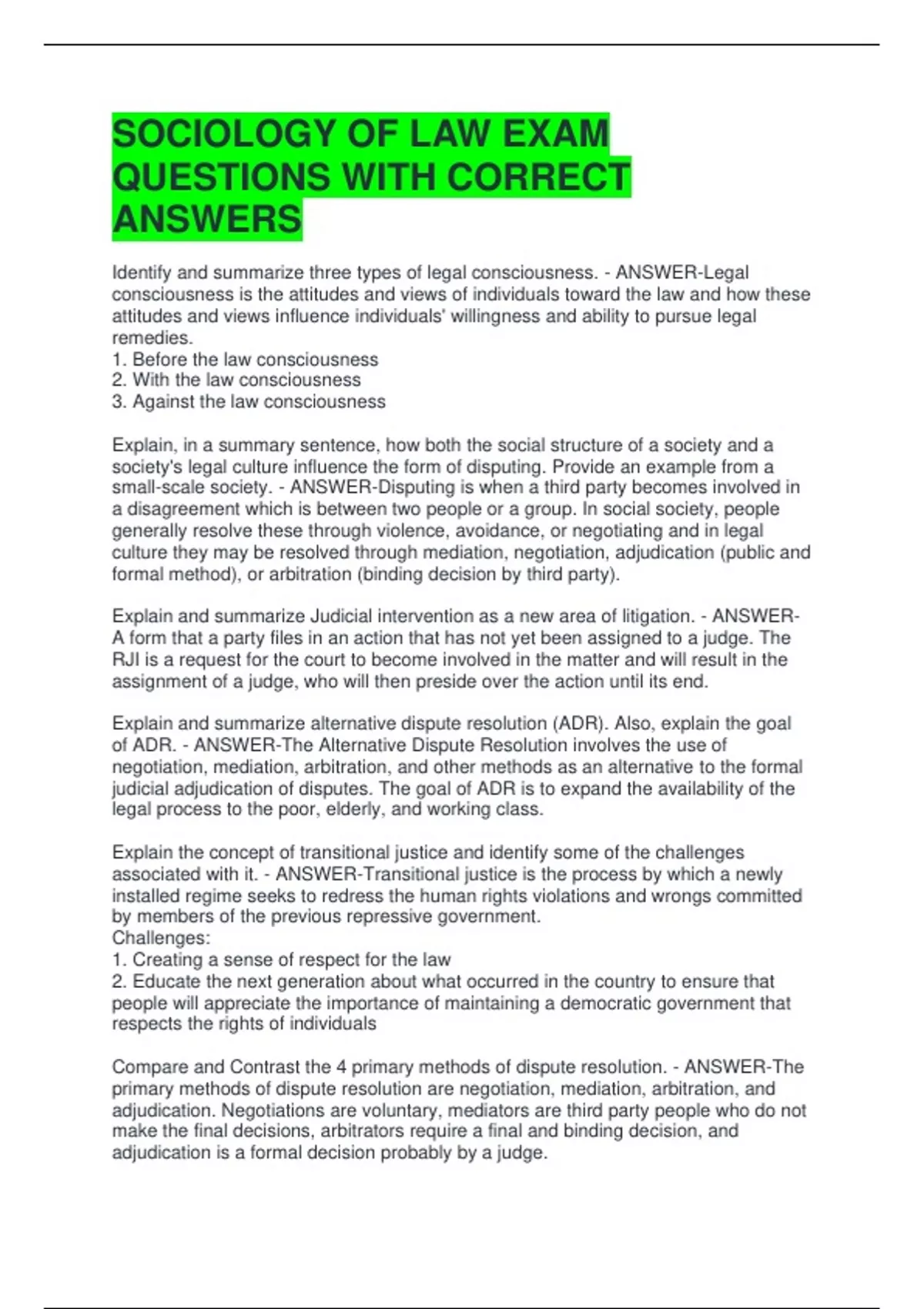 SOCIOLOGY OF LAW EXAM QUESTIONS WITH CORRECT ANSWERS Identify and summarize three types of legal consciousness. - ANSWER-Legal consciousness is the attitudes and views of individuals toward the law and how these attitudes and views influence individuals' willingness and ability to pursue legal remedies. 1. Before the law consciousness 2. With the law consciousness 3. Against the law consciousness Explain, in a summary sentence, how both the social structure of a society and a society's legal culture influence the form of disputing. Provide an example from a small-scale society. - ANSWER-Disputing is when a third party becomes involved in a disagreement which is between two people or a group. In social society, people generally resolve these through violence, avoidance, or negotiating and in legal culture they may be resolved through mediation, negotiation, adjudication (public and formal method), or arbitration (binding decision by third party). Explain and summarize Judicial intervention as a new area of litigation. - ANSWER-A form that a party files in an action that has not yet been assigned to a judge. The RJI is a request for the court to become involved in the matter and will result in the assignment of a judge, who will then preside over the action until its end. Explain and summarize alternative dispute resolution (ADR). Also, explain the goal of ADR. - ANSWER-The Alternative Dispute Resolution involves the use of negotiation, mediation, arbitration, and other methods as an alternative to the formal judicial adjudication of disputes. The goal of ADR is to expand the availability of the legal process to the poor, elderly, and working class. Explain the concept of transitional justice and identify some of the challenges associated with it. - ANSWER-Transitional justice is the process by which a newly installed regime seeks to redress the human rights violations and wrongs committed by members of the previous repressive government. Challenges: 1. Creating a sense of respect for the law 2. Educate the next generation about what occurred in the country to ensure that people will appreciate the importance of maintaining a democratic government that respects the rights of individuals Compare and Contrast the 4 primary methods of dispute resolution. - ANSWER-The primary methods of dispute resolution are negotiation, mediation, arbitration, and adjudication. Negotiations are voluntary, mediators are third party people who do not make the final decisions, arbitrators require a final and binding decision, and adjudication is a formal decision probably by a judge.