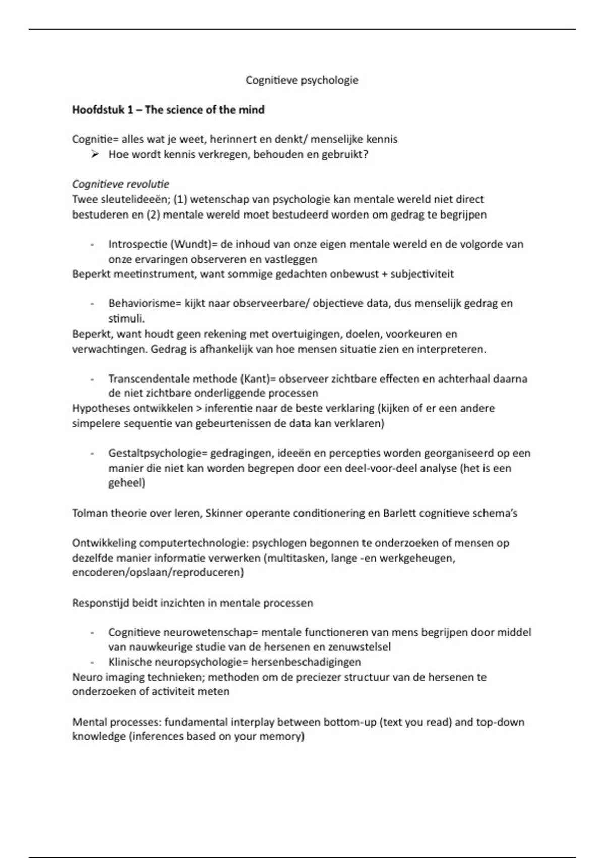 Een volledige samenvatting van het vak cognitieve psychologie, inclusief belangrijke aantekeningen van de colleges. Ik heb zelf een 8,5 gehaald met deze samenvatting
