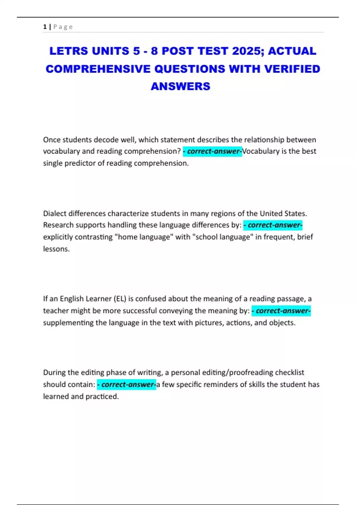 LETRS UNITS 5 - 8 POST TEST 2025; ACTUAL COMPREHENSIVE QUESTIONS WITH VERIFIED ANSWERS