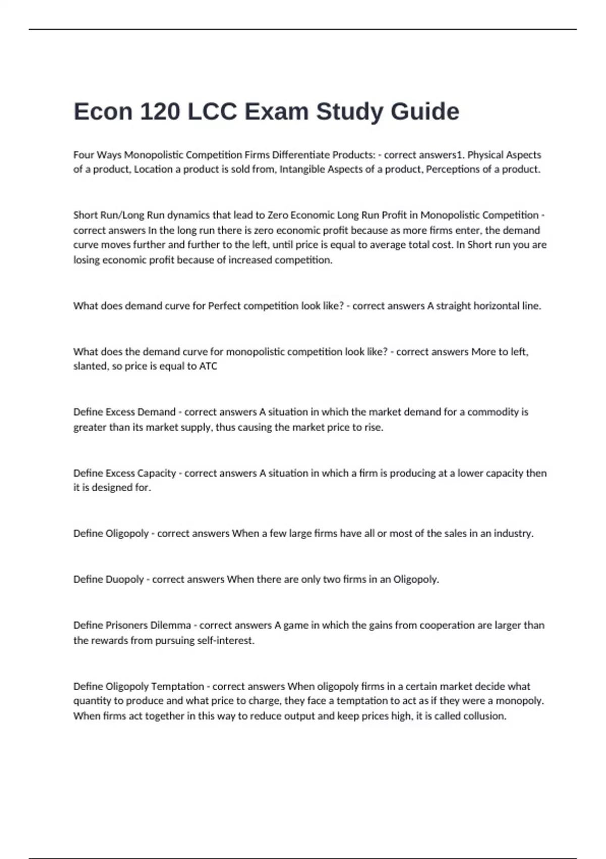 Four Ways Monopolistic Competition Firms Differentiate Products: - correct answers1. Physical Aspects of a product, Location a product is sold from, Intangible Aspects of a product, Perceptions of a product. Short Run/Long Run dynamics that lead to Zero Economic Long Run Profit in Monopolistic Competition - correct answers In the long run there is zero economic profit because as more firms enter, the demand curve moves further and further to the left, until price is equal to average total cost. In Short run you are losing economic profit because of increased competition. What does demand curve for Perfect competition look like? - correct answers A straight horizontal line. What does the demand curve for monopolistic competition look like? - correct answers More to left, slanted, so price is equal to ATC Define Excess Demand - correct answers A situation in which the market demand for a commodity is greater than its market supply, thus causing the market price to rise. Define Excess Capacity - correct answers A situation in which a firm is producing at a lower capacity then it is designed for. Define Oligopoly - correct answers When a few large firms have all or most of the sales in an industry. Define Duopoly - correct answers When there are only two firms in an Oligopoly. Define Prisoners Dilemma - correct answers A game in which the gains from cooperation are larger than the rewards from pursuing self-interest. Define Oligopoly Temptation - correct answers When oligopoly firms in a certain market decide what quantity to produce and what price to charge, they face a temptation to act as if they were a monopoly. When firms act together in this way to reduce output and keep prices high, it is called collusion. Kinked Demand Curve - correct answers a perceived demand curve that arises when competing oligopoly firms commit to match price cuts, but not price increases Six Challenges to Collusion in an Oligopoly - correct answers1. Large Numbers 2.Complex Products and Pricing Schemes 3.Differences in Interests 4.Bargaining Power of Buyers 5.Legal and Political Pressure 6. Egos of top Executives. Define HHI - correct answers Measure of market concentration Define Four Firm Concentration Ratio - correct answers The proportion of total output in an industry produced by the four largest firms in an industry. Cost- Plus Regulation - correct answers Refers to government regulation of a firm which sets the price that a firm can charge over a period of time by looking at the firm's accounting costs and then adding a normal rate of profit. price cap regulation - correct answers When the regulator sets a price that a firm cannot exceed over the next few years Regulatory Capture - correct answers when the supposedly regulated firms end up playing a large role in setting the regulations that they will follow and as a result, they "capture" the people usually through the promise of a job in that "regulated" industry once their term in government has ended. Four Restrictive Practices Antitrust laws seek to Prohibit - correct answers1. Minimum Resale Price Maintenance Agreement 2. Exclusive Dealing 3. Tie-in sales 4. Predatory Pricing Nationalization - correct answers Nationalization refers to when a government takes control of a company or industry, which generally occurs without compensation for the loss of the net worth of seized assets and potential income. Privatization - correct answers The transfer of ownership, property or business from the government to the private sector. Absolute Advantage - correct answers a country has an absolute advantage over another country in producing a good if it uses fewer resources to produce that good. Comparative Advantage - correct answers When a country can produce a good at a lower cost in terms of other goods, or when a country has a lower opportunity cost of production. Splitting up the Value Chain - correct answers Recent trend in trade when many of the different stages of producing a good happen in different geographic locations. Sources of Comparative Advantage - correct answers1. Difference in Climate 2. Difference in Technology 3. Difference in Factor Endowments Autarky - correct answers A situation in which a country cannot trade with other countries World Trade Organization - correct answers Organization that seeks to negotiate reductions in barriers to trade and to adjudicate complaints about violations of international trade policy; successor to the General Agreement on Tariffs and Trade Heckscher-Olin Model - correct answers A country has comparative advantage in a good whose production is intensive in factors that are abundantly available in that country. Three Types of Protectionism Tools - correct answers1. Tariffs 2. Import Quotas 3. Non-tariff Barriers Why do governments prefer Tariffs over Quotas? - correct answers Governments get money out of Tariffs. They don't get Tariffs out of quotas. What are the important environmental issues of today? - correct answers Air and Water Pollution Hazardous waste disposal Destruction of wetlands and inhabitants Global Warming Extinct Species Problems with Command and Control Regulations - correct answers1. Command and Control Regulations offer no incentive to improve the Environment 2. Command and Control Regulations are Inflexible 3.Command and Control Regulations are set by Legislators and Bureaucrats Market Friendly Tool #1 - correct answers Pollution charge: A tax imposed on the quantity of pollution that a firm emits. Market Friendly Tool #2 - correct answers Marketable Permits: A license that allows a firm to emit certain amounts of pollution, where firms with more permits than the pollution level they cause sell the surplus permit to others. Market Friendly Tool #3 - correct answers Well Defined Property Rights 4 Interventions to address International Environmental Issues? - correct answers High Income Countries (HICs) pay Low Income Countries (LICs) to reduce emissions of greenhouse gases. 2. High Inco