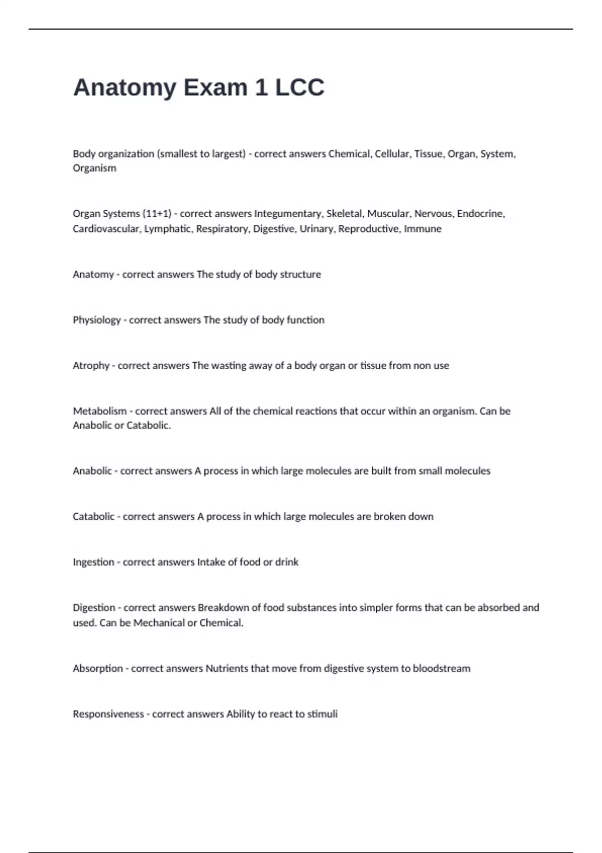 Body organization (smallest to largest) - correct answers Chemical, Cellular, Tissue, Organ, System, Organism Organ Systems (11+1) - correct answers Integumentary, Skeletal, Muscular, Nervous, Endocrine, Cardiovascular, Lymphatic, Respiratory, Digestive, Urinary, Reproductive, Immune Anatomy - correct answers The study of body structure Physiology - correct answers The study of body function Atrophy - correct answers The wasting away of a body organ or tissue from non use Metabolism - correct answers All of the chemical reactions that occur within an organism. Can be Anabolic or Catabolic. Anabolic - correct answers A process in which large molecules are built from small molecules Catabolic - correct answers A process in which large molecules are broken down Ingestion - correct answers Intake of food or drink Digestion - correct answers Breakdown of food substances into simpler forms that can be absorbed and used. Can be Mechanical or Chemical. Absorption - correct answers Nutrients that move from digestive system to bloodstream Responsiveness - correct answers Ability to react to stimuli Differentiation - correct answers Process in which cells become specialized in structure and function Reproduction - correct answers The process of producing offspring anatomical position - correct answers Erect, body forward, palms forward, arms at side, parallel legs Midsagittal Plane - correct answers The plane dividing the body into equal right and left halves Parasagittal Plane - correct answers Vertical plane passing through the body from front to back, dividing the body into unequal left and right sides Frontal plane - correct answers Divides the body into anterior and posterior portions Traverse Plane - correct answers Divides the body into upper and lower portions Oblique Plane - correct answers Divides body at an angle Superior - correct answers Higher on the body, nearer to the head Inferior - correct answers Lower on the body, farther from the head Anterior - correct answers Toward the front Posterior - correct answers Toward the back Ventral - correct answers Toward the belly Dorsal - correct answers Toward the spine Medial - correct answers Toward the midline Lateral - correct answers Away from the midline Ipsilateral - correct answers On the same side of the body Contralateral - correct answers On the opposite side of the body Proximal - correct answers Closer to the point of attachment Distal - correct answers Away from the point of attachment Superficial - correct answers Near the surface of the body Deep - correct answers Away from the body surface; more internal External - correct answers Located outside the body Internal - correct answers Located within the body Ventral cavity contains - correct answers Thoracic cavity and Abdominopelvic cavity separated by the diaphragm Thoracic cavity contains - correct answers Pleural cavity, Pericardial cavity, Mediastinum Pleural cavity contains - correct answers Lungs, Pleural membranes Mediastinum cavity contains - correct answers Thing between and around the heart and lungs. Pericardial cavity contains - correct answers Heart, Pericardium membranes Abdominopelvic cavity contains - correct answers Abdominal and Pelvic cavity Abdominal cavity contains - correct answers Digestive organs, spleen, kidneys, liver, extends inferiorly to the brim of the pelvis Pelvic cavity contains - correct answers urinary bladder, reproductive organs, rectum Dorsal cavity contains - correct answers cranial cavity and spinal cavity cranial cavity contains - correct answers skull, brain spinal cavity contains - correct answers spinal cord Membrane types - correct answers mucous, serous Mucous membrane - correct answers an epithelial tissue that secretes mucus and that lines many body cavities and tubular organs lining of various body cavities, including the nose, ears, and mouth Serous membrane - correct answers a thin layer of tissue that covers internal body cavities and secretes a fluid that keeps the membrane moist; also called serosa Parietal layer - correct answers lines the internal surface of the cavity wall Visceral layer - correct answers covers external surface of organs Acrominal - correct answers pertaining to the point of the shoulder Antebrechial - correct answers pertaining to the forearm Antecubital - correct answers pertaining to the front of the elbow Axillary - correct answers pertaining to the armpit Brachial - correct answers pertaining to the arm Buccal - correct answers pertaining to the cheek Calcaneal - correct answers pertaining to the heel Carpal - correct answers pertaining to the wrist Cephalic - correct answers pertaining to the head Cervical - correct answers pertaining to the neck Coccygeal - correct answers pertaining to the tailbone Coxal - correct answers pertaining to the hip Cranial - correct answers pertaining to the skull Crural - correct answers pertaining to the leg (shin) Cubital - correct answers pertaining to the elbow Digital - correct answers pertaining to the fingers or toes Dorsum - correct answers pertaining to the top of the foot or back of the hand Facial - correct answers pertaining to the face Femoral - correct answers pertaining to the thigh Frontal - correct answers pertaining to the forehead Gluteal - correct answers pertaining to the buttocks Hallux - correct answers pertaining to the big toe Ingunial - correct answers pertaining to the groin Lumbar - correct answers pertaining to the area of the back between the ribs and hips; the loin Mammary - correct answers pertaining to the breast Manual - correct a