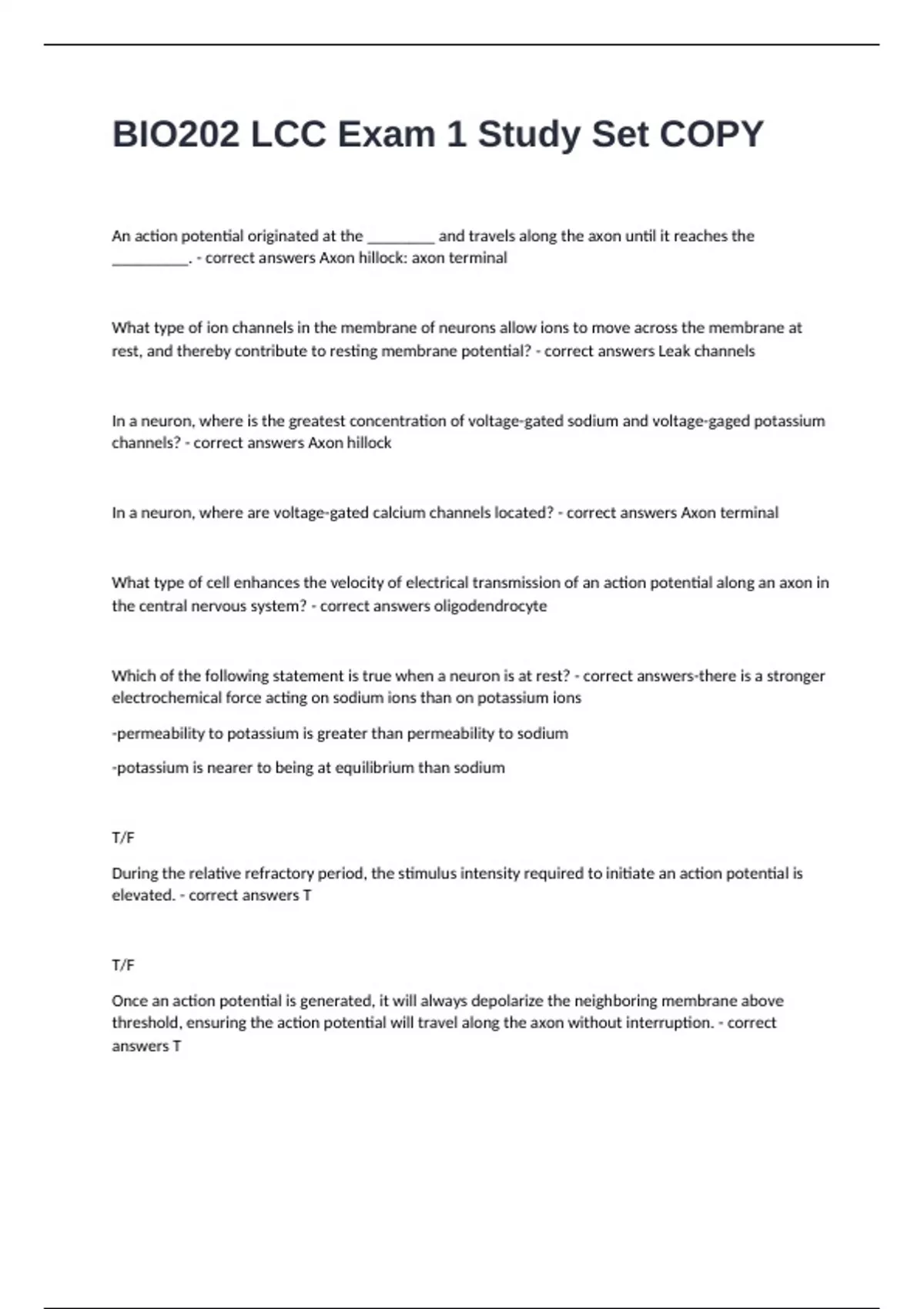 An action potential originated at the ________ and travels along the axon until it reaches the _________. - correct answers Axon hillock: axon terminal What type of ion channels in the membrane of neurons allow ions to move across the membrane at rest, and thereby contribute to resting membrane potential? - correct answers Leak channels In a neuron, where is the greatest concentration of voltage-gated sodium and voltage-gaged potassium channels? - correct answers Axon hillock In a neuron, where are voltage-gated calcium channels located? - correct answers Axon terminal What type of cell enhances the velocity of electrical transmission of an action potential along an axon in the central nervous system? - correct answers oligodendrocyte Which of the following statement is true when a neuron is at rest? - correct answers-there is a stronger electrochemical force acting on sodium ions than on potassium ions -permeability to potassium is greater than permeability to sodium -potassium is nearer to being at equilibrium than sodium T/F During the relative refractory period, the stimulus intensity required to initiate an action potential is elevated. - correct answers T T/F Once an action potential is generated, it will always depolarize the neighboring membrane above threshold, ensuring the action potential will travel along the axon without interruption. - correct answers T T/F The NA+/K+ pump is electrogenic. - correct answersT Which of the following is NOT one of the major cell types found in the human body? a. Endocrine cells b. Muscle cells c. Epithelial cells d. Nervous cells e. Connective tissue cells - correct answers A- endocrine cells The process of maintaining the internal environment in a state compatible for life is called ___________, and it occurs primarily through __________. - correct answers Homeostasis, negative feedback Which of the following is NOT a part of the internal environment? - correct answers Airway to lungs Exercise provides a substantial stressor to many systems of the body, including the cardiovascular system, forcing the body to_______________. - correct answers Prioritize resource allocation What type of gland secretes products into ducts leading to the external environment? - correct answers Exocrine glands What is the primary mechanism for maintaining homeostasis? - correct answers negative feedback Which transport processes can be saturated, that is, can reach a transport maximum? - correct answers-Secondary active transport -Primary active transport -Facilitated diffusion The concentration of an anion inside a cell is 0.3%. The concentration of this anion outside the cell is 0.1%. How could the cell obtain more of this ion inside the cell? - correct answers a