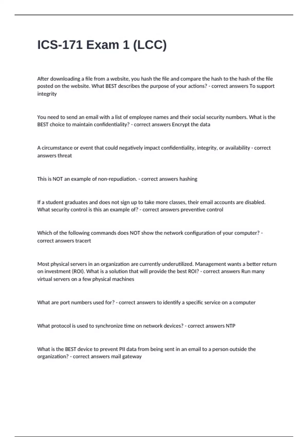 After downloading a file from a website, you hash the file and compare the hash to the hash of the file posted on the website. What BEST describes the purpose of your actions? - correct answers To support integrity You need to send an email with a list of employee names and their social security numbers. What is the BEST choice to maintain confidentiality? - correct answers Encrypt the data A circumstance or event that could negatively impact confidentiality, integrity, or availability - correct answers threat This is NOT an example of non-repudiation. - correct answers hashing If a student graduates and does not sign up to take more classes, their email accounts are disabled. What security control is this an example of? - correct answers preventive control Which of the following commands does NOT show the network configuration of your computer? - correct answers tracert Most physical servers in an organization are currently underutilized. Management wants a better return on investment (ROI). What is a solution that will provide the best ROI? - correct answers Run many virtual servers on a few physical machines What are port numbers used for? - correct answers to identify a specific service on a computer What protocol is used to synchronize time on network devices? - correct answers NTP What is the BEST device to prevent PII data from being sent in an email to a person outside the organization? - correct answers mail gateway Which authentication service provides a SSO solution for different environments using a federated identity management system? - correct answers Shibboleth Which authentication service is NOT a SSO solution? - correct answers Kerberos What is stored in the /etc/passwd file in Linux? - correct answers information about user accounts on the system Steganography without encryption provides what goal? - correct answers obfuscation Russian hackers in Russia are sending messages from Russia to their collaborators in the USA. What is a security algorithm that they might be using for encrypting their messages? - correct answersRijndael-128, CBC The steghide command in Linux does what? - correct answers hides and encrypts one file inside a second file Instead of creating access control settings based on each student, the system administrator created a Student group that has the access control settings for a generic student. When students create an account online, their account is automatically updated with the same access control settings as the Student group. What type of access control is this? - correct answers RBAC You live on Oahu, but telecommute to an IT job in California for the higher salary. You are able to work at home; however, when you meet several of your Oahu co-workers at Starbucks to collaborate face-to-face, you and your co-workers are unable to connect to the company's network. What is the MOST likely reason that y'all cannot access the company's network? - correct answer location-based policy You are setting up an access control system that uses different security levels. For example, Top Secret Level, Secret Level, Confidential Level, and Official Use Level. What type of access control is this? - correct answers MAC You are setting up an access control system that considers the subject, object, action, and environment for authorization. For example, employees are only allowed to access the company printers when they are using a computer in the company's building during the work week during the hours of 9am to 5pm. What type of access control is this? - correct answers ABAC From a security perspective, what should be done with an employee's account when the employee leaves an organization? - correct answers disable the account What is Wireshark used for? - correct answers capturing and analyzing network traffic Which Linux command is used for capturing and analyzing network traffic? - correct answers tcpdump Which Linux command can be used for capturing HTTP traffic? - correct answers dumpcap What data is stored in an ARP table? - correct answers IP addresses and MAC addresses Which protocol uses TCP port 23? - correct answers Telnet Which protocol uses TCP port 22? - correct answers SSH Which application do we use capture and view network traffic? - correct answers Wireshark When we connect with another computer using SSH, the data sent over the network is _____. - correct answers encrypted Which protocol is used for connection oriented traffic over the network? - correct answers TCP _____ is an attack where the data in the cache is modified by the attackers. - correct answers poisoning attack ARP matches _____ addresses to _____ addresses. - correct answersIPv4, MAC What does an attacker need for a successful sniffing attack? - correct answers a protocol analyzer and cleartext traffic Which protocol is used for connectionless traffic over the network? - correct answers UDP What port number is used for SSH? - correct answers22 What protocol is a secure way to log in from your laptop to a remote server? - correct answers SSH What folder on UHUNIX is used to store web pages? - correct answers public _html Your organization requires that all employee data sent over the network be encrypted. Which of the following protocols would NOT meet this requirement? - correct answers FTP Which of the following protocols does NOT use TCP port 22? - correct answers FTP You are enabling SSH on some servers and all workstations on the organization's network. Which of the following use cases are you MOST likely supporting with this action? - correct answers Encrypt data traveling across the network You want to support the CIA triad for voice and video transmissions. What protocol will you enable on all workstations on the organization's network? - correct answers SRTP You are enabling RTP on all workstations on the organization's network. Which of the following use cases are you MOST likely supporting with this action? - correct answers Support voice and video transmission