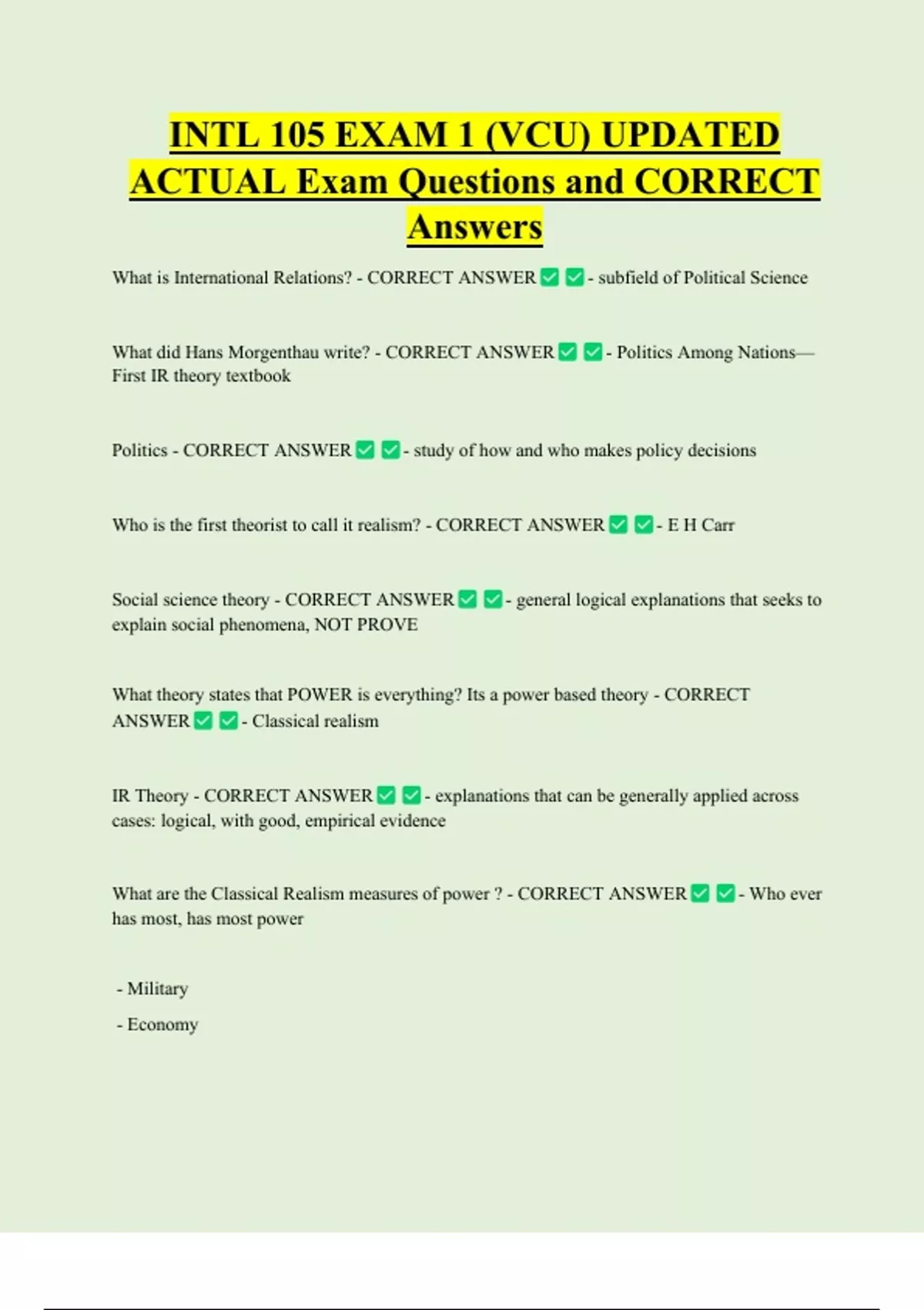 INTL 105 EXAM 1 (VCU) UPDATED ACTUAL Exam Questions and CORRECT Answers What is International Relations? - CORRECT ANSWER What did Hans Morgenthau write? - CORRECT ANSWER First IR theory textbook Politics - CORRECT ANSWER - subfield of Political Science - Politics Among Nations—- study of how and who makes policy decisions Who is the first theorist to call it realism? - CORRECT ANSWER Social science theory - CORRECT ANSWER - E H Carr
