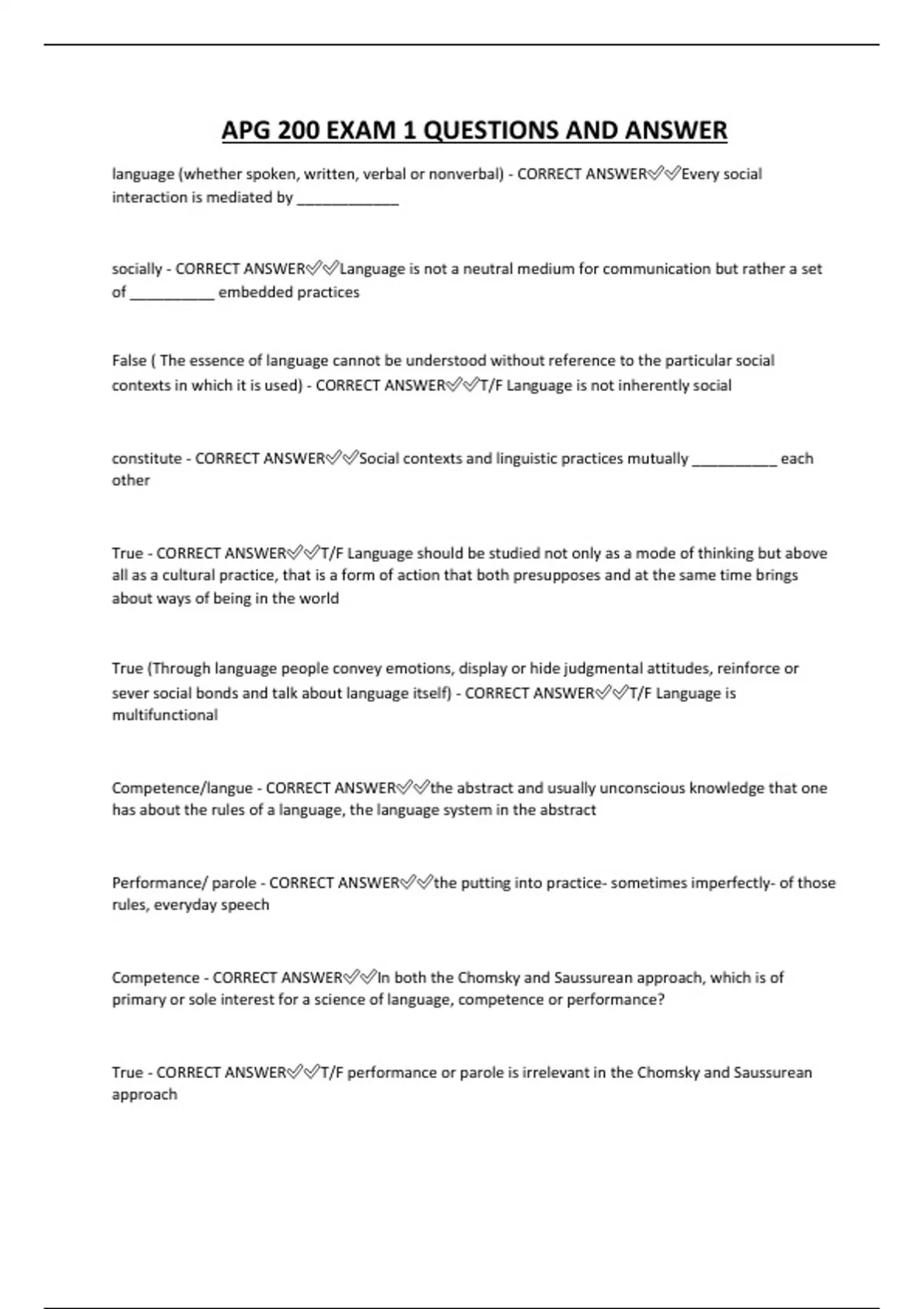 True - CORRECT ANSWER✅✅T/F performance or parole is irrelevant in the Chomsky and Saussurean