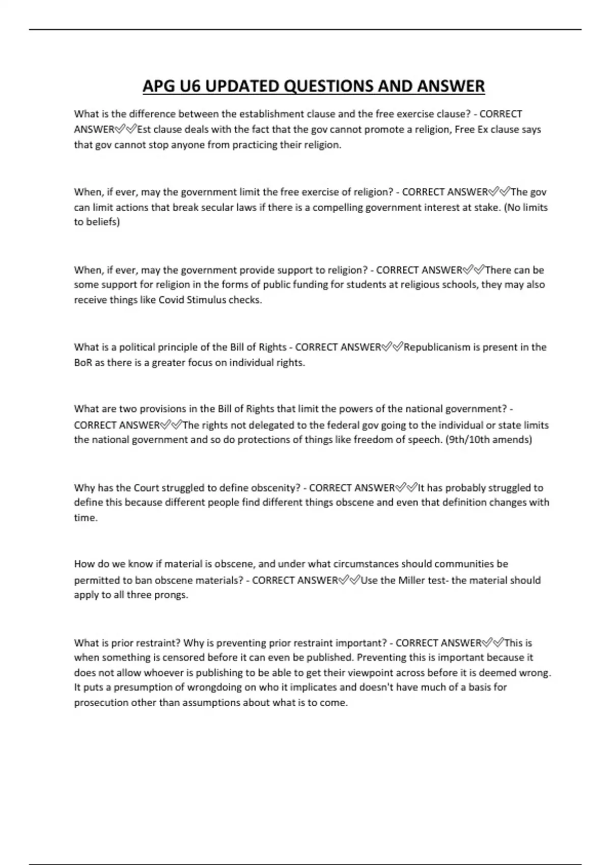 ANSWER✅✅Est clause deals with the fact that the gov cannot promote a religion, Free Ex clause says