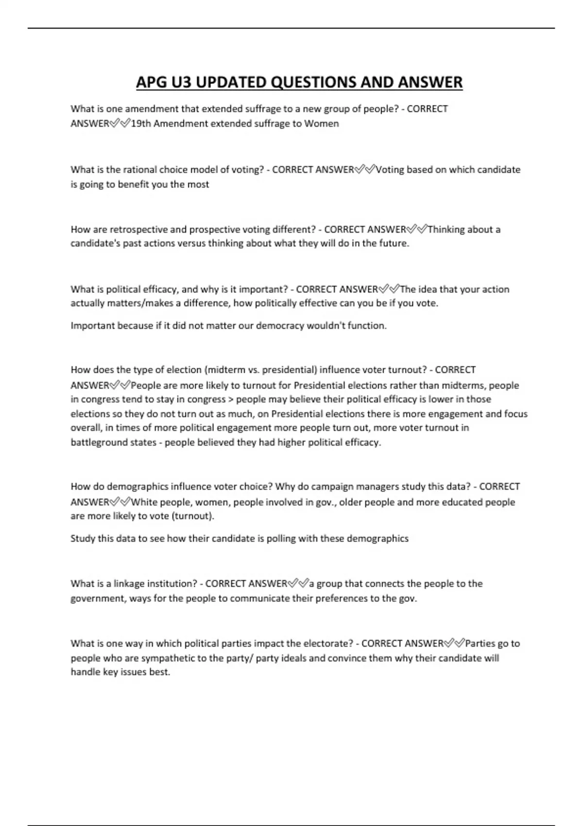 APG U3 UPDATED QUESTIONS AND ANSWER What is one amendment that extended suffrage to a new group of people? - CORRECT ANSWER19th Amendment extended suffrage to Women
