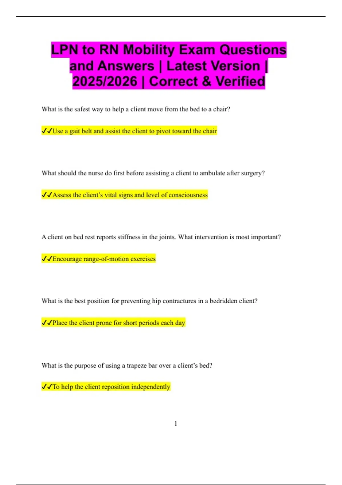 LPN to RN Mobility Exam Questions and Answers | Latest Version | 2025/2026 | Correct & Verified What is the safest way to help a client move from the bed to a chair? Use a gait belt and assist the client to pivot toward the chair What should the nurse do first before assisting a client to ambulate after surgery? Assess the client’s vital signs and level of consciousness A client on bed rest reports stiffness in the joints. What intervention is most important? Encourage range-of-motion exercises What is the best position for preventing hip contractures in a bedridden client? Place the client prone for short periods each day What is the purpose of using a trapeze bar over a client’s bed? To help the client reposition independently 2 What is the correct device for a client with left-sided weakness learning to walk again? A cane used on the stronger side How should the nurse teach a client to use crutches when going upstairs? Step up with the strong leg first, then move crutches and weak leg together What should the nurse assess for when a client is placed in traction? Skin integrity around pressure points and device sites What is the primary risk of immobility in the respiratory system? Atelectasis and pneumonia Which exercise best prevents muscle atrophy in immobilized clients? Isometric exercises What is the priority action when a client becomes dizzy during ambulation? Slowly lower the client to the floor to prevent injury 3 Why are footboards used in clients who are bedridden? To prevent foot drop What should the nurse do when a client with Parkinson’s disease has a shuffling gait? Encourage the client to take deliberate, larger steps What is the best way to transfer a client from bed to wheelchair if one side is weaker? Place the wheelchair on the stronger side What is the most important safety step before moving a client from stretcher to bed? Lock the wheels of both the stretcher and the bed What device can reduce the risk of pressure injuries in immobile clients? An air mattress What is the primary nursing action when applying sequential compression devices (SCDs)? Ensure proper fit and check skin integrity regularly 4 What is the main reason dangling at the