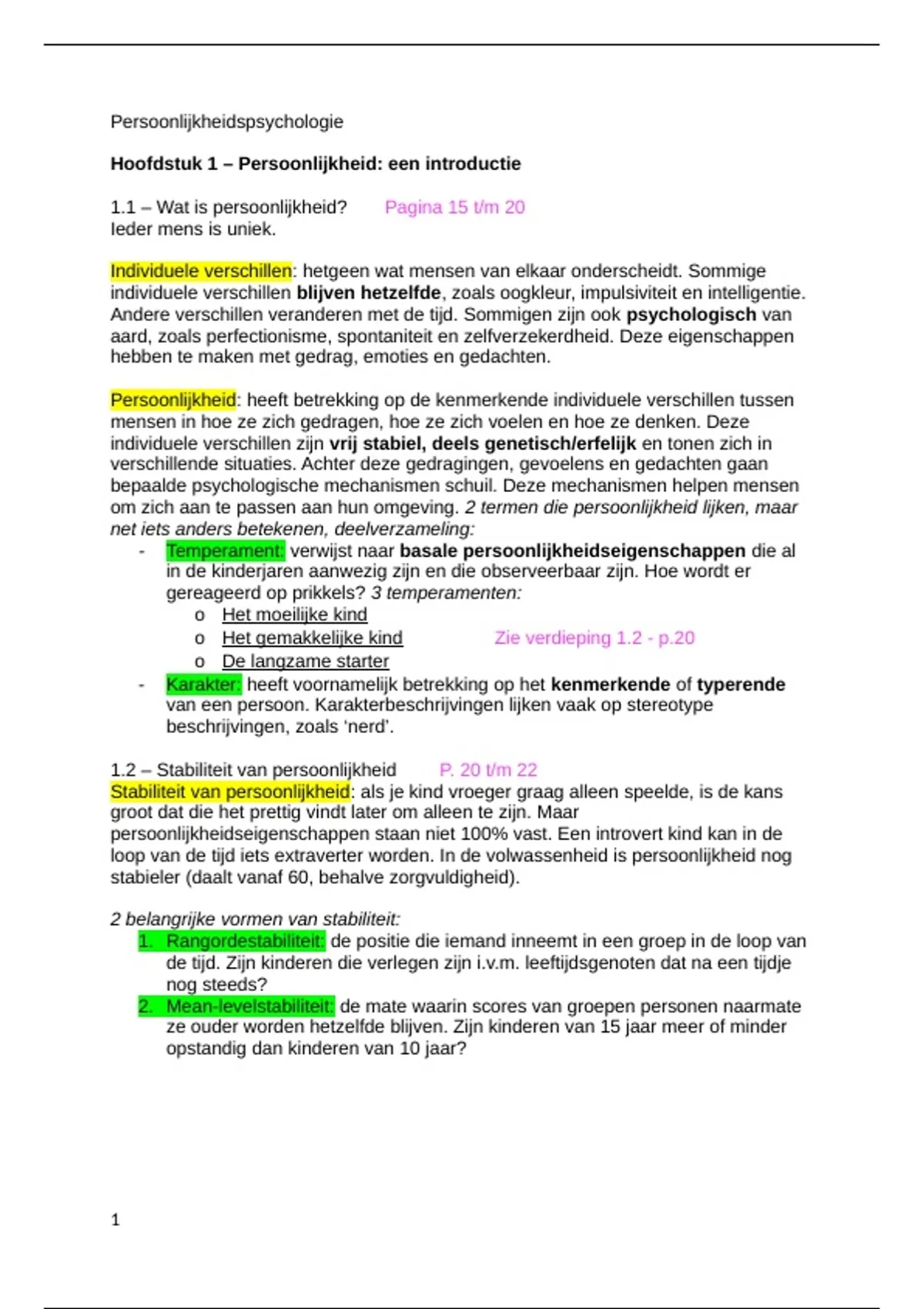 Gebruikte boek: persoonlijkheidspsychologie Dit was een open boek toets, dus de pagina's van de boeken staan in de samenvatting om deze makkelijk terug te vinden in het boek tijdens de toets. Aan het einde is er een inhoudsopgave te vinden, zodat je tijdens de toets snel kan zin welk onderwerp op welke pagina in de samenvatting staat. Het heeft dus ook pagina nummers. Tot slot heb ik ook antwoordvoorbeelden hier opgeschreven over hoe je persoonlijkheid correct uit kan leggen op de toets. Hierdoor had ik het wel gehaald uiteindelijk. Of neem contact op voor korting. In het document gebruiken ik kleuren, foto's en dik gedrukte/onderstreepte/schuingedrukte woorden om makkelijk te kunnen leren en een goed overzicht te hebben over elk onderwerp. Ik ben zelf erg perfectionistisch, dus alles wat geleerd moest worden toen staat in dit document.