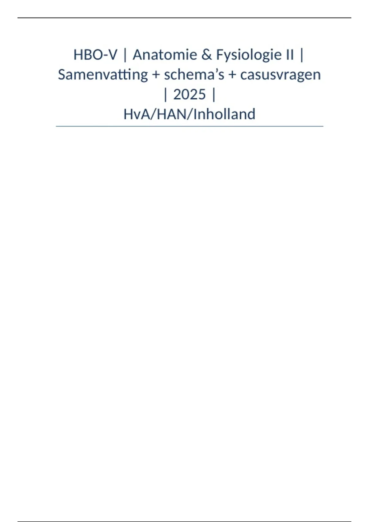 Dit document bevat een uitgebreide en actuele samenvatting van Anatomie & Fysiologie II voor studenten HBO-Verpleegkunde aan de HAN (Hogeschool van Arnhem en Nijmegen). Inhoud van dit document: 10-minuten overzicht met kernbegrippen Uitwerking van de hoofdstukken: Zenuwstelsel (centraal, perifeer, autonoom) Hormoonstelsel (hypothalamus-hypofyse-as, schildklier, bijnieren, pancreas) Immuunsysteem (aangeboren & verworven, antistoffen & antigenen) Huid (opbouw en functies) Zintuigen (oog, oor, smaak, reuk, tast) Voortplanting & zwangerschap 15 casusvragen met antwoorden zoals op het tentamen Spiekkaart met hormonen, immuunsysteem en kernbegrippen Aantal pagina’s: ± 30 Studiejaar: Jaar 1 HBO-V (propedeuse, blok 3–4) Tentamendata: eerste kans mei 2025, herkansing juni/juli 2025 Geschikt voor: studenten HBO-V aan de HAN, maar ook bruikbaar voor HvA, Saxion, Avans, Inholland en andere hogescholen. Met dit document ben je compleet en efficiënt voorbereid op het tentamen Anatomie & Fysiologie II.