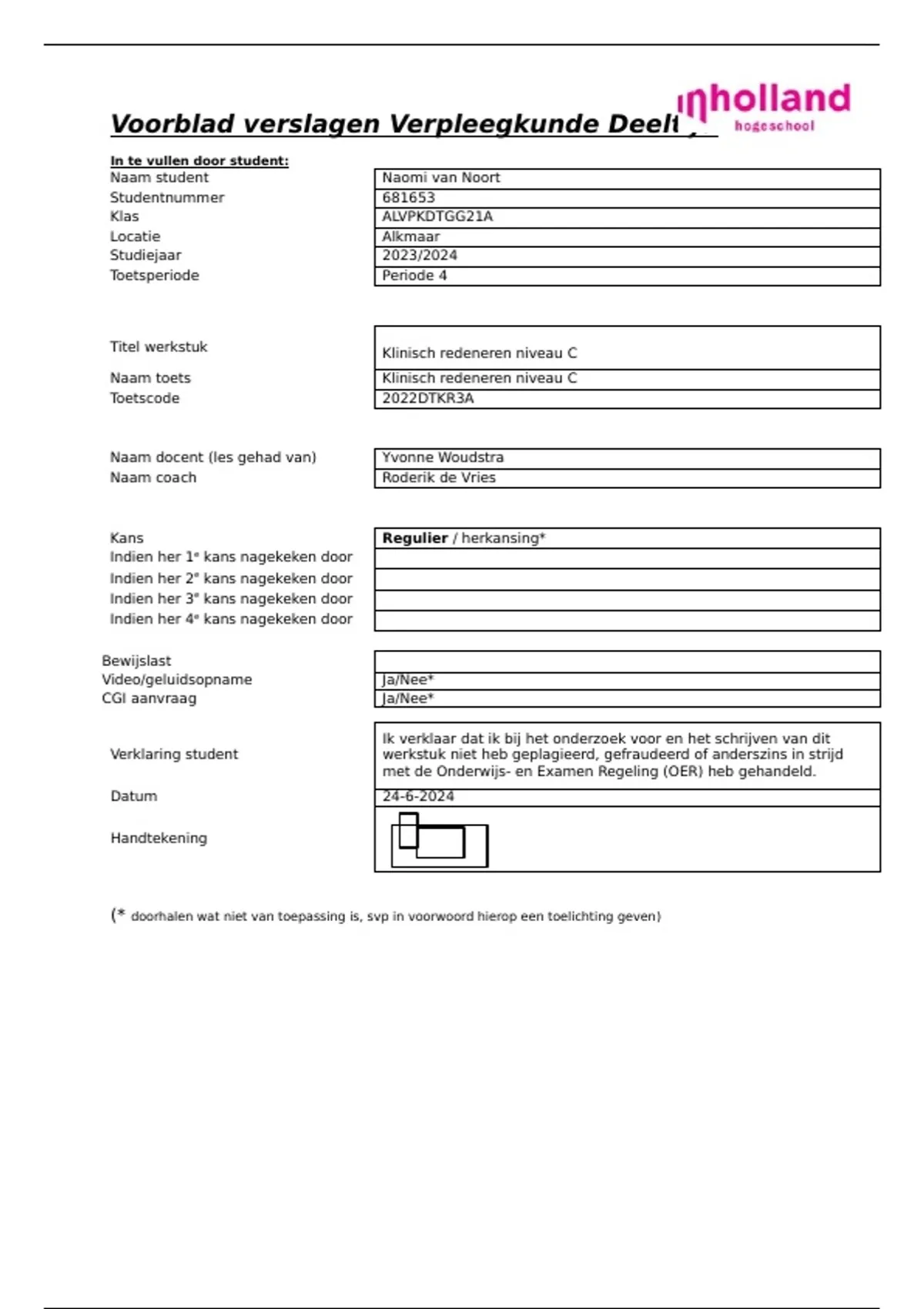 Verklaring student werkstuk niet heb geplagieerd, gefraudeerd of anderszins in strijd