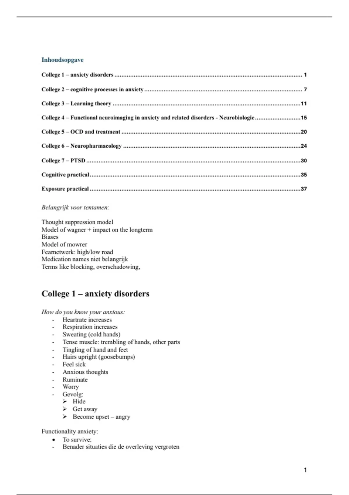 complete samenvatting colleges en practicals_AnxietyandRelatedDisorders_GGZjaar2_blok5