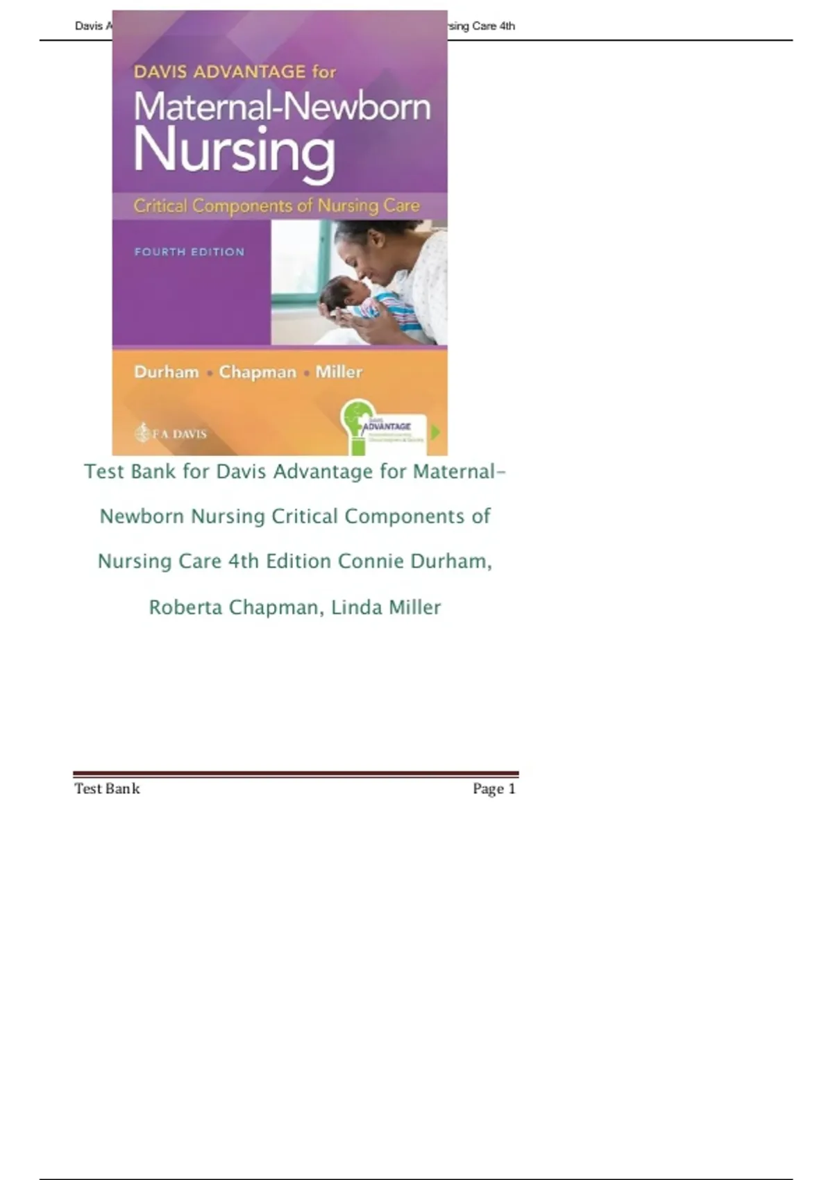 Test Bank for Davis Advantage for Maternal Newborn Nursing; Critical Components of Nursing Care 4th Edition by Connie Durham and Roberta Chapman (NEWEST 2025)