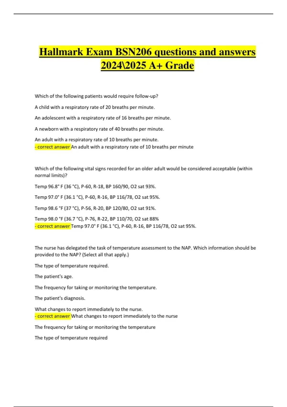 This document provides the complete and latest updated set of questions and verified correct answers for the Hallmark University BSN206 Exam 2025. It covers key nursing topics such as health assessment, patient safety, pharmacology, care planning, and evidence-based practice. Verified and graded A+, this resource is designed to support nursing students in mastering the BSN206 curriculum and achieving success on their exam.