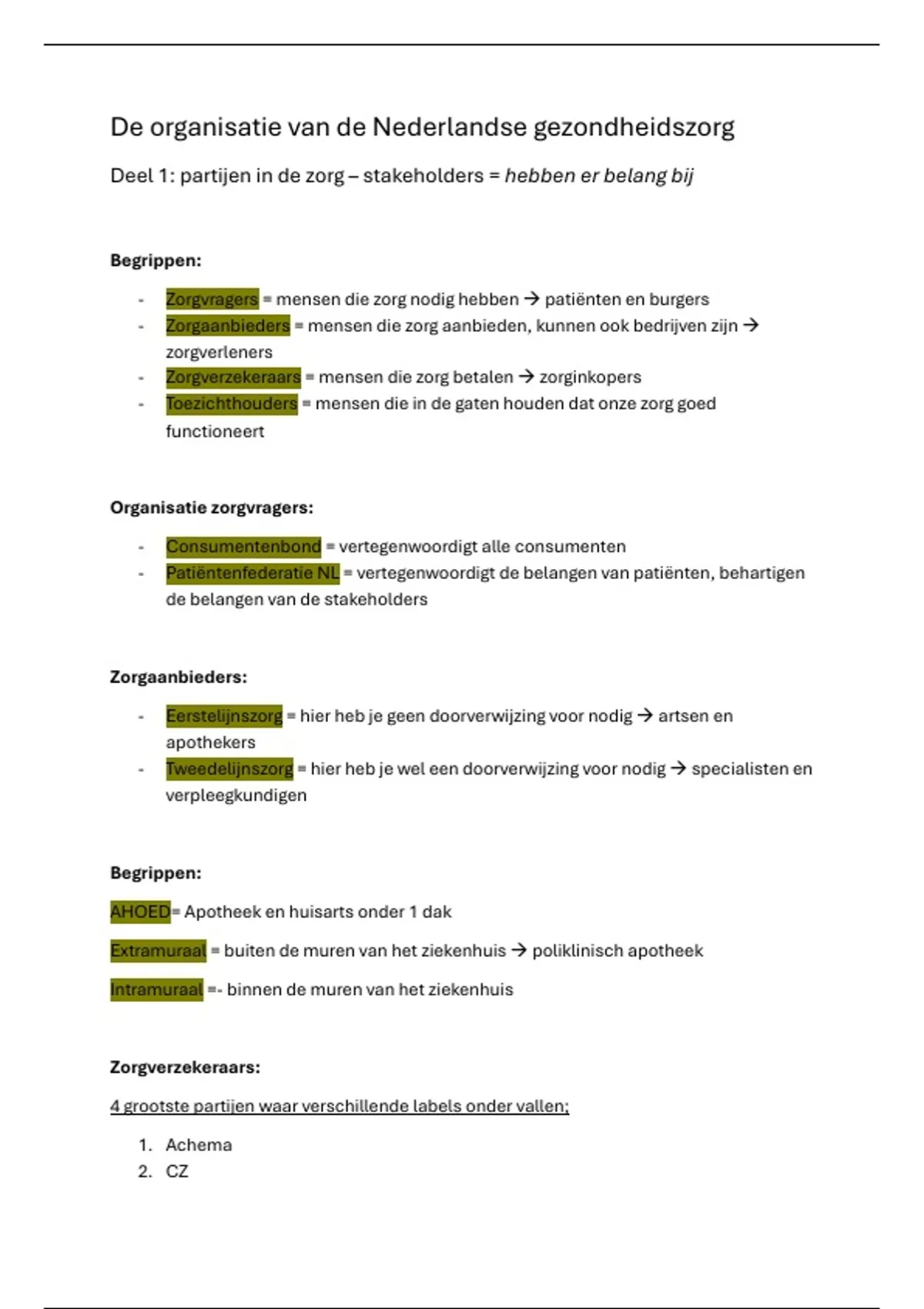 In deze samenvatting komen de volgende onderdelen aan boord, de samenvatting hoort bij de testvision toets van werkveld1 en is grotendeels ook gekoppeld aan het boek 'geneesmiddelen in de zorg' ik heb met deze samenvatting een 8 gehaald.: - partijen in de zorg - zorgverzekeraars - zorgaanbieders - organisatie zorgvragers - overheid en toezichthouders - stelselwetten - relevante wetgeving - markten in de curatieve zorg - kenmerken zorg markten - stappen tot een geneesmiddel op de markt komen - vergoedingstrajecten - behandeling met geneesmiddelen - schakels distributie keten
