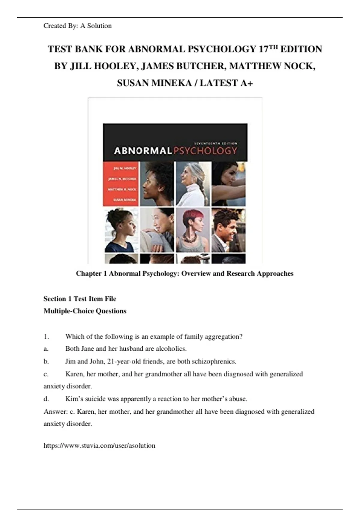 TEST BANK FOR ABNORMAL PSYCHOLOGY 17TH EDITION
