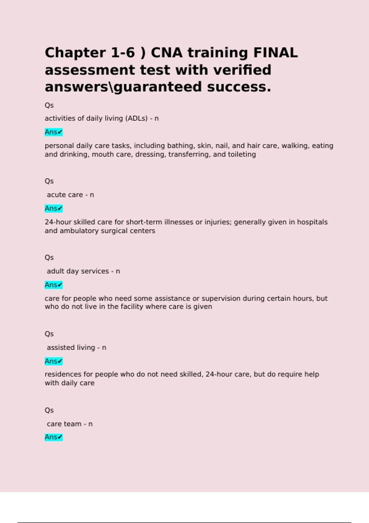 Chapter 1-6 ) CNA training FINAL assessment test with verified answersguaranteed success. Qs activities of daily living (ADLs) - n Ans personal daily care tasks, including bathing, skin, nail, and hair care, walking, eating and drinking, mouth care, dressing, transferring, and toileting Qs acute care - n Ans 24-hour skilled care for short-term illnesses or injuries; generally given in hospitals and ambulatory surgical centers Qs adult day services - n Ans care for people who need some assistance or supervision during certain hours, but who do not live in the facility where care is given Qs assisted living - n Ans residences for people who do not need skilled, 24-hour care, but do require help with daily care Qs