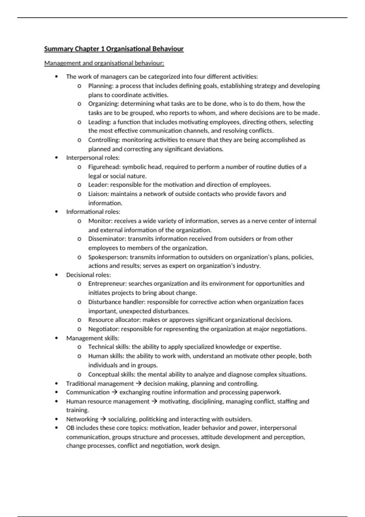 This summary includes Chapter 1 up to and including Chapter 18, excluding Chapters 11,13,14,15,16 from the book Organizational Behaviour by Robbins, S., & Judge, T. A. (2019). It includes all of the materials that need to be studied for the Organisational Behaviour exam, including definition lists per chapter.