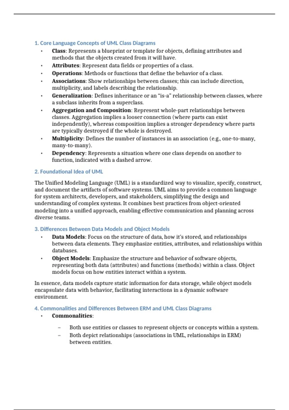 Dit document geeft een uitgebreid overzicht van de kernconcepten van UML Class Diagrams en hun rol binnen objectgeoriënteerde modellering. Eerst worden de basisbegrippen toegelicht, zoals klassen, attributen, operaties, associaties, generalisatie, aggregatie, compositie en afhankelijkheden. Vervolgens wordt de betekenis van UML als gestandaardiseerde modelleertaal besproken, en worden verschillen en overeenkomsten tussen datamodellen, objectmodellen, ERM en UML Class Diagrams uitgewerkt. Tot slot wordt aandacht besteed aan semantische en syntactische nuances, de intensie en extensie van klassen, en de manier waarop UML de kernconcepten van objectoriëntatie ondersteunt. Het document sluit af met een kritische reflectie op de sterke punten en beperkingen van UML Class Diagrams in het modelleren van complexe systemen.