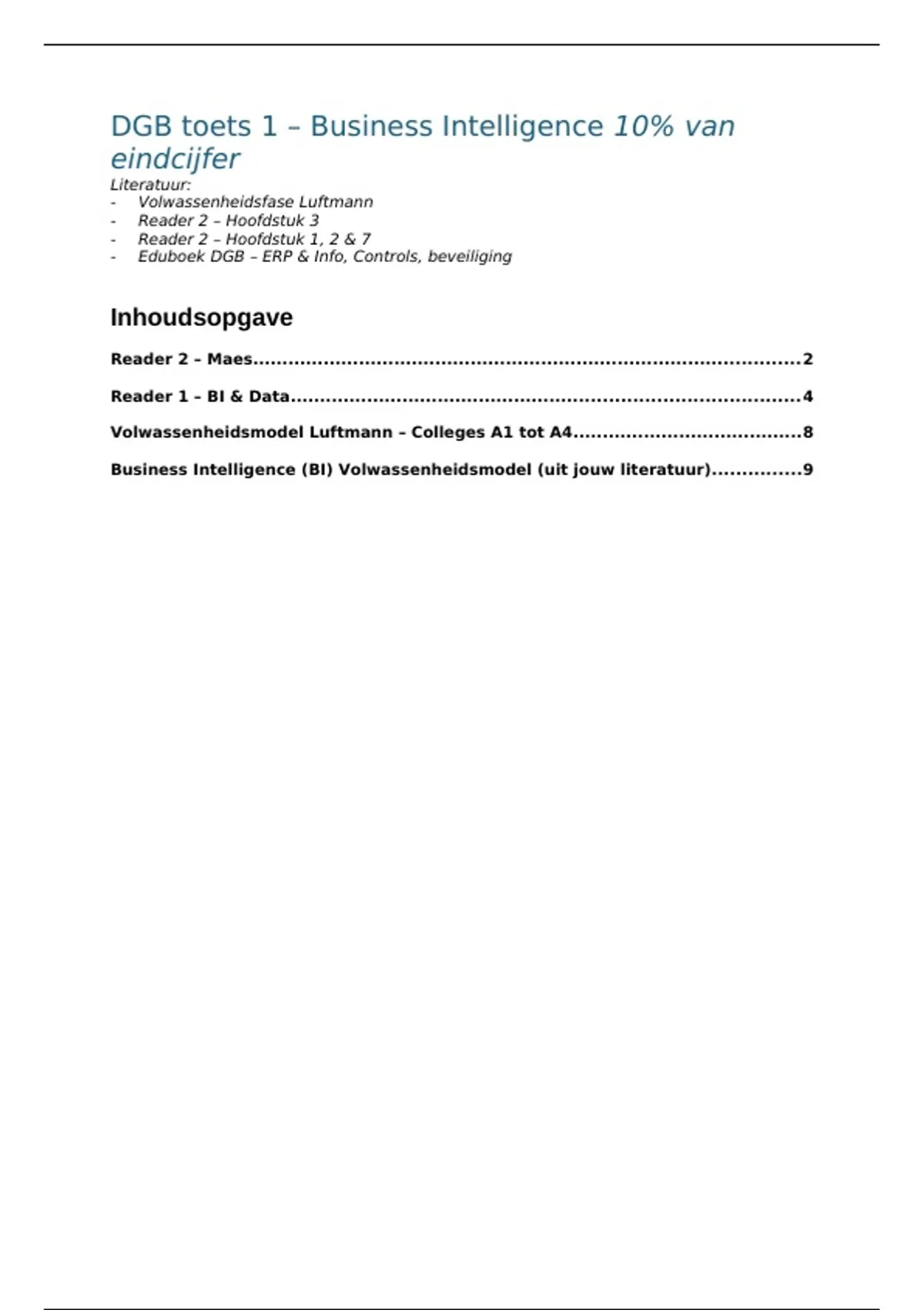 Business Intelligence (BI) Volwassenheidsmodel (uit jouw literatuur)...............9