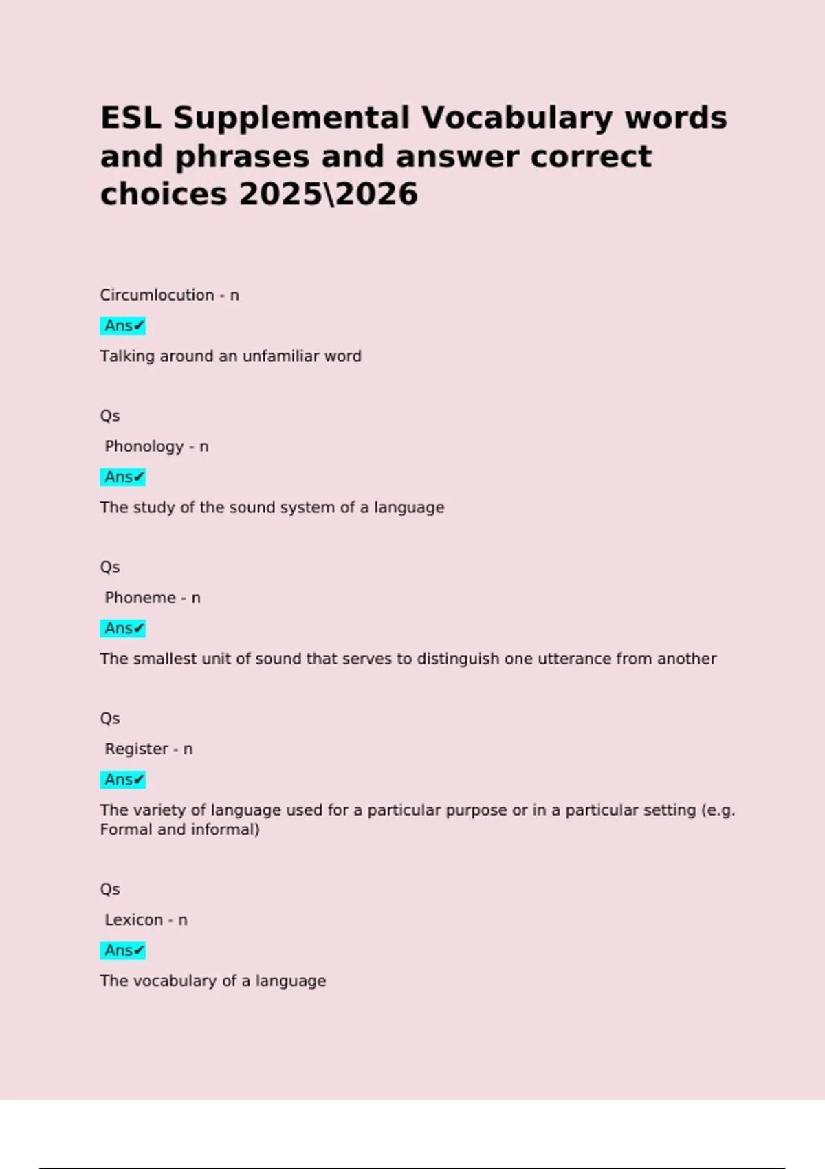 ESL Supplemental Vocabulary words and phrases and answer correct choices Circumlocution - n Ans Talking around an unfamiliar word Qs Phonology - n Ans The study of the sound system of a language Qs Phoneme - n Ans The smallest unit of sound that serves to distinguish one utterance from another Qs Register - n Ans The variety of language used for a particular purpose or in a particular setting (e.g. Formal and informal) Qs Lexicon - n