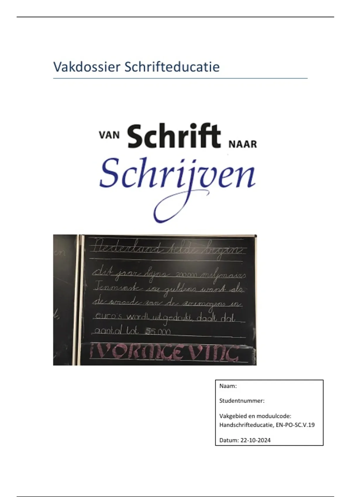 Dit document is mijn Vakdossier van het vak Hand-/ schrifteducatie voor de Lerarenopleiding basisonderwijs/ PABO. Dit vak is een zelfstudie vak op het Windesheim. Ik heb voor dit vakdossier een 9,6 gekregen. Het document bevat alle onderdelen die in het vakdossier horen te zitten. Het document bestaat uit 48 pagina's. Gebruik dit vakdossier ter inspiratie voor jouw eigen vakdossier.