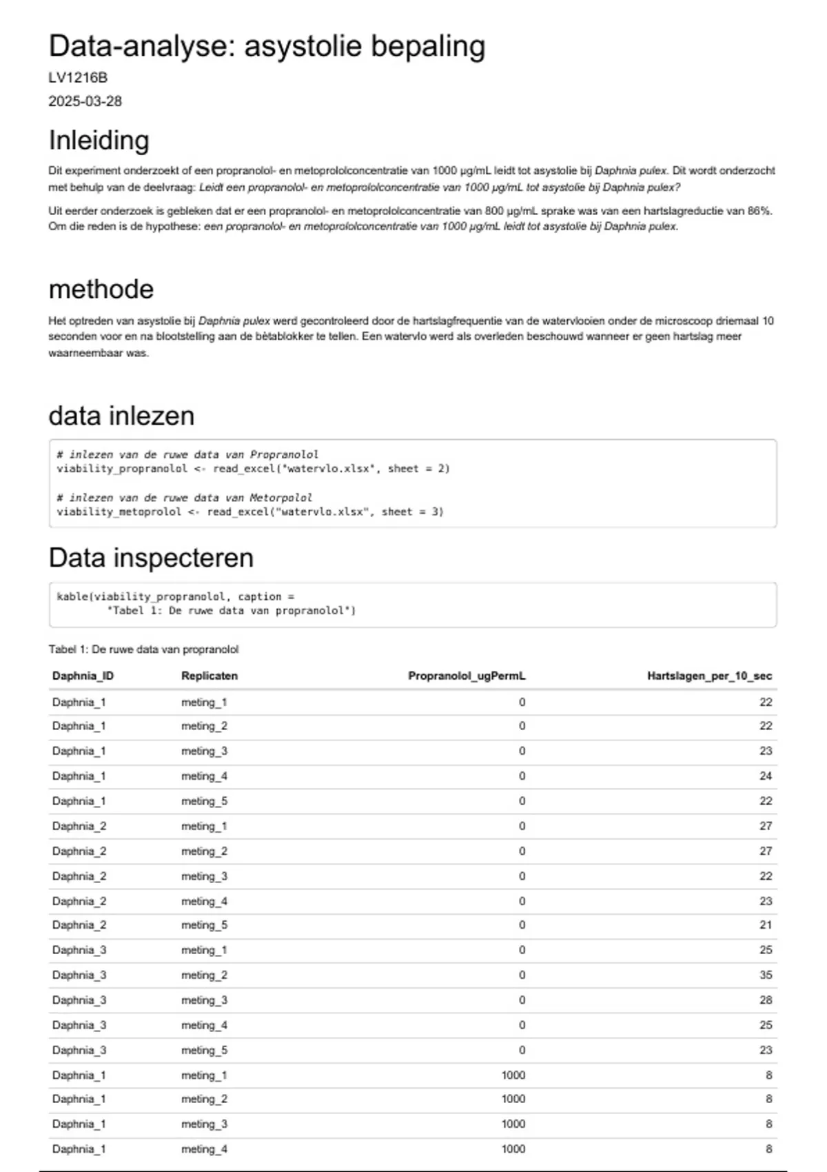 Dit verslag onderzoekt of een concentratie van 1000 µg/mL propranolol en metoprolol leidt tot asystolie bij Daphnia pulex. Het experiment is uitgevoerd binnen het project Humane Ziekten (periode C) aan de Hogeschool Utrecht. De hypothese stelt dat deze hoge concentratie van bètablokkers de hartslag volledig stillegt bij de watervlo. De hartslag werd gemeten met behulp van microscopie, waarbij per Daphnia vijf replicaten zijn uitgevoerd vóór en na blootstelling. De ruwe data zijn geanalyseerd in R Studio en gevisualiseerd met scatterplots en boxplots. Er is gecontroleerd op outliers met behulp van de Dixon Q test, waarna de hartslagfrequentie is omgerekend naar bpm. Voor zowel propranolol als metoprolol zijn de gemiddelde hartslag, standaarddeviatie en variatiecoëfficiënt berekend per Daphnia. De resultaten tonen dat propranolol bij één Daphnia daadwerkelijk leidt tot asystolie (0 bpm), terwijl bij andere individuen een sterke daling in hartslag zichtbaar is. Metoprolol veroorzaakt eveneens een significante daling, maar niet volledig stilstand. Het verslag bevat tabellen, grafieken en statistische verwerking van de data. De resultaten worden besproken in relatie tot biologische variatie en betrouwbaarheid van de metingen. Dit document is geschikt voor studenten biologie, medisch laboratoriumonderzoek en biomedische wetenschappen die werken met diermodellen, farmacologische stoffen en statistiek.
