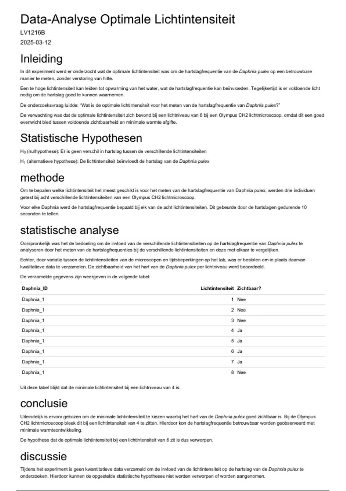 De onderzoeksvraag luidde: “Wat is de optimale lichtintensiteit voor het meten van de hartslagfrequentie van Daphnia pulex?”