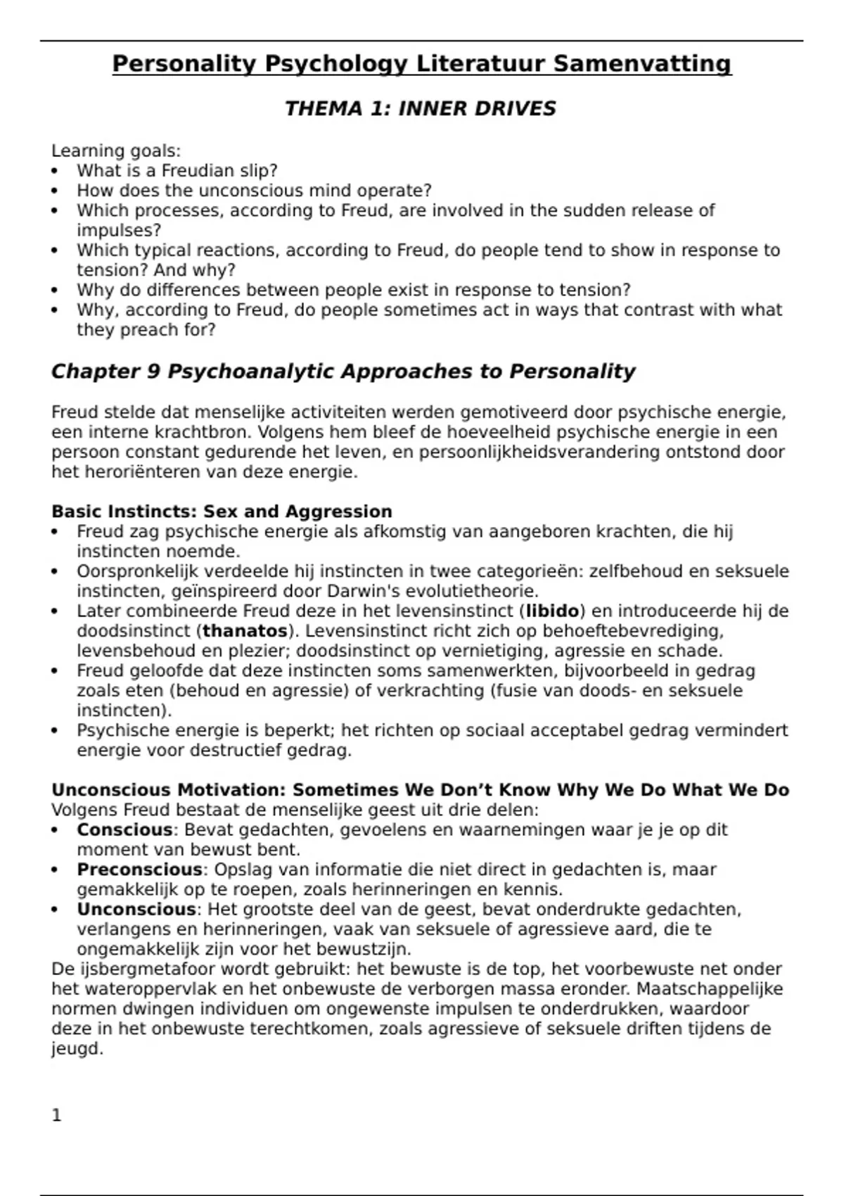  Unconscious: Het grootste deel van de geest, bevat onderdrukte gedachten,