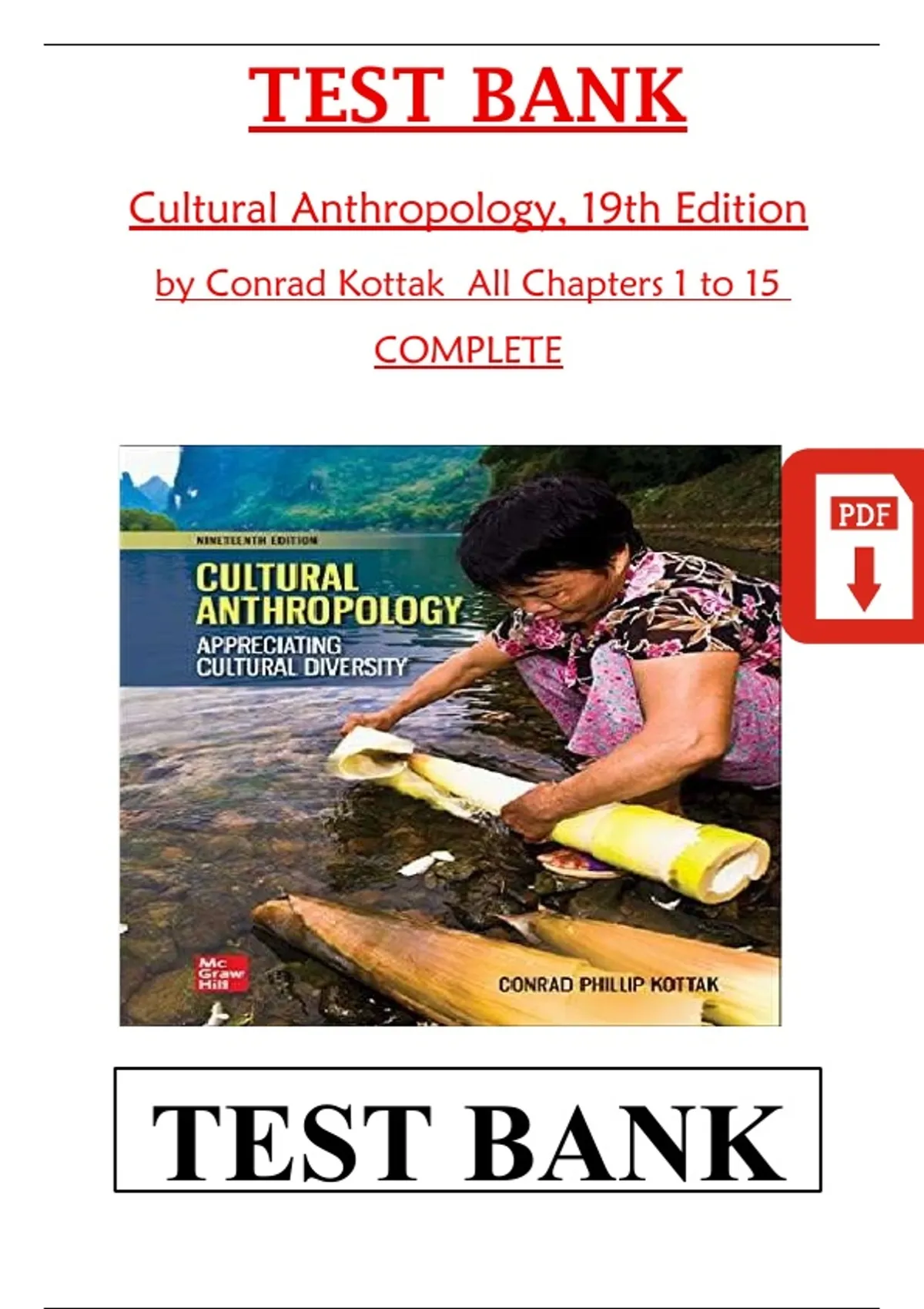 Test Bank for Cultural Anthropology, 19th Edition by Conrad Kottak – All Chapters 1–15 Complete This document provides the complete test bank for Cultural Anthropology (19th Edition) by Conrad Kottak. It includes multiple choice, true/false, and short-answer questions with verified correct answers for all chapters 1 through 15. Covering key anthropological concepts such as culture, kinship, language, belief systems, social organization, and globalization, this resource is ideal for students seeking to strengthen their understanding of cultural anthropology and prepare effectively for exams.