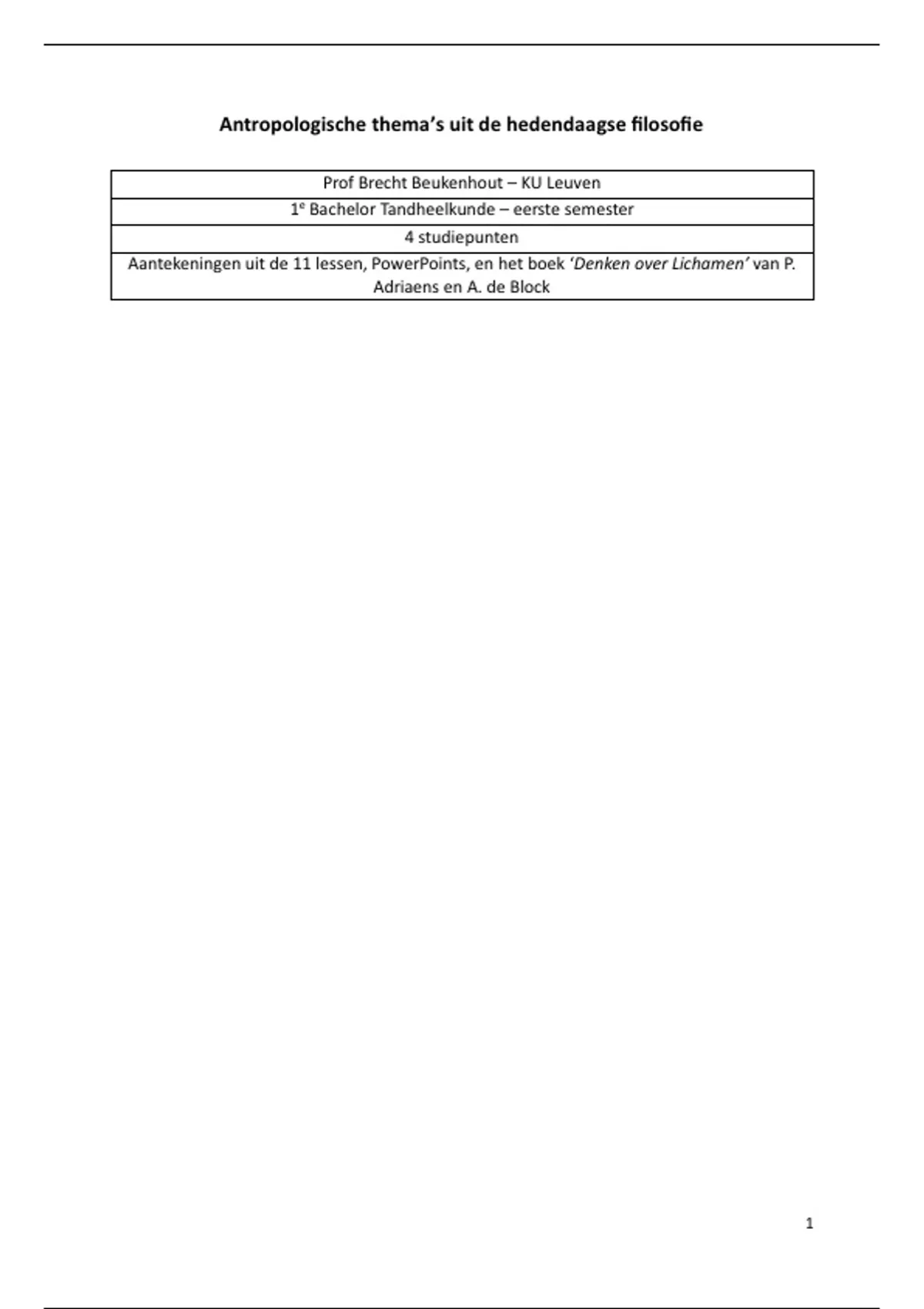 Aantekeningen uit de 11 lessen, PowerPoints, en het boek ‘Denken over Lichamen’ van P.