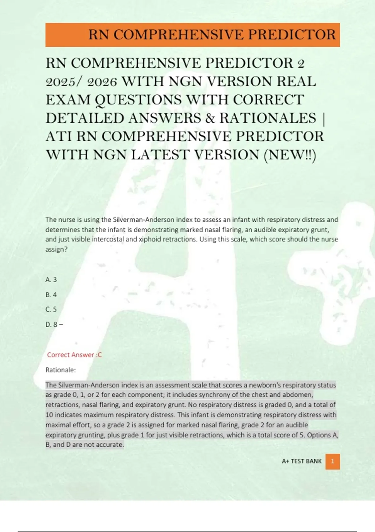 RN COMPREHENSIVE PREDICTOR 2 2025/ 2026 WITH NGN VERSION REAL EXAM QUESTIONS WITH CORRECT DETAILED ANSWERS & RATIONALES | ATI RN COMPREHENSIVE PREDICTOR WITH NGN LATEST VERSION (NEW!!) The nurse is using the Silverman-Anderson index to assess an infant with respiratory distress and determines that the infant is demonstrating marked nasal flaring, an audible expiratory grunt, and just visible intercostal and xiphoid retractions. Using this scale, which score should the nurse assign? A. 3 B. 4 C. 5 D. 8 – Correct Answer :C Rationale: The Silverman-Anderson index is an assessment scale that scores a newborn's respiratory status as grade 0, 1, or 2 for each component; it includes synchrony of the chest and abdomen, retractions, nasal flaring, and expiratory grunt. No respiratory distress is graded 0, and a total of 10 indicates maximum respiratory distress. This infant is demonstrating respiratory distress with maximal effort, so a grade 2 is assigned for marked nasal flaring, grade 2 for an audible expiratory grunting, plus grade 1 for just visible retractions, which is a total score of 5. Options A, B, and D are not accurate. A+ TEST BANK 1 RN COMPREHENSIVE PREDICTOR The nurse is teaching a new mother about diet and breastfeeding. Which instruction is most important to include in the teaching plan? A. Avoid alcohol because it is excreted in breast milk. B. Eat a high-roughage diet to help prevent constipation. C. Increase caloric intake by approximately 500 cal/day. D. Increase fluid intake to at least 3 quarts each day. – Correct Answer :A Rationale: Alcohol should be avoided while breastfeeding because it is excreted in breast milk and may cause a variety of problems, including slower growth and cognitive impairment for the infant. Options B, C, and D should also be included in diet teaching for a breastfeeding mother; however, because these do not involve safety of the infant, they do not have the same degree of importance as option A. The nurse is teaching care of the newborn to a childbirth preparation class and describes the need for administering antibiotic ointment into the eyes of the newborn. An expectant father asks, "What type of disease causes infections in babies that can be prevented by using this ointment?" Which response by the nurse is accurate? A. Herpes B. Trichomonas C. Gonorrhea D. Syphilis – Correct Answer :C Rationale: A+ TEST BANK 2 RN COMPREHENSIVE PREDICTOR Erythromycin ointment is instilled into the lower conjunctiva of each eye within 2 hours after birth to prevent ophthalmia neonatorum, an infection caused by gonorrhea, and inclusion conjunctivitis, an infection caused by Chlamydia. The infant may be exposed to these bacteria when passing through the birth canal. Ophthalmic ointment is not effective against option A, B, or D. A new mother is having trouble breastfeeding her newborn. The child is making frantic rooting motions and will not grasp the nipple. Which intervention should the nurse implement? A. Encourage frequent use of a pacifier so that the infant becomes accustomed to sucking. B. Hold the infant's head firmly against the breast until he latches onto the nipple. C. Encourage the mother to stop feeding for a few minutes and comfort the infant. D. Provide formula for the infant until he becomes calm, and then offer the breast again. – Correct Answer :C Rationale: The infant is becoming frustrated and so is the mother; both need a time out. The mother should be encouraged to comfort the infant and to relax herself. After such a time out, breastfeeding is often more successful. Options A and D would cause nipple confusion. Option B would only cause the infant to be more resistant, resulting in the mother and infant becoming more frustrated. A 38-week primigravida who works as a secretary and sits at a computer 8 hours each day tells the nurse that her feet have begun to swell. Which instruction will aid in the prevention of pooling of blood in the lower extremities? A.Wear support stockings. B. Reduce salt in the diet. C. Move about every hour. D. Avoid constrictive clothing. –