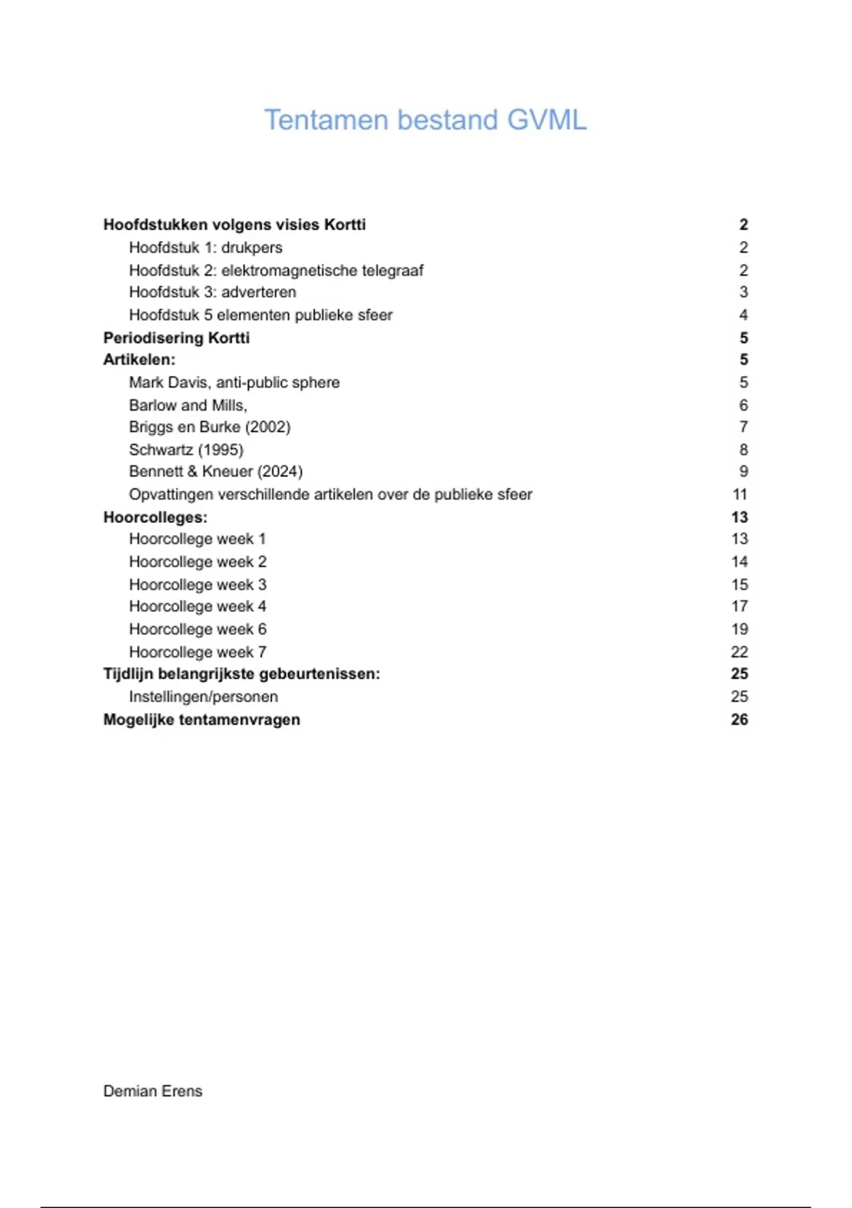 Volledige tentamenstof van het vak Geschiedenis van het medialandschap. Inclusief verbanden die gelegd worden tussen de artikelen, hoorcolleges en het boek van Kortti.