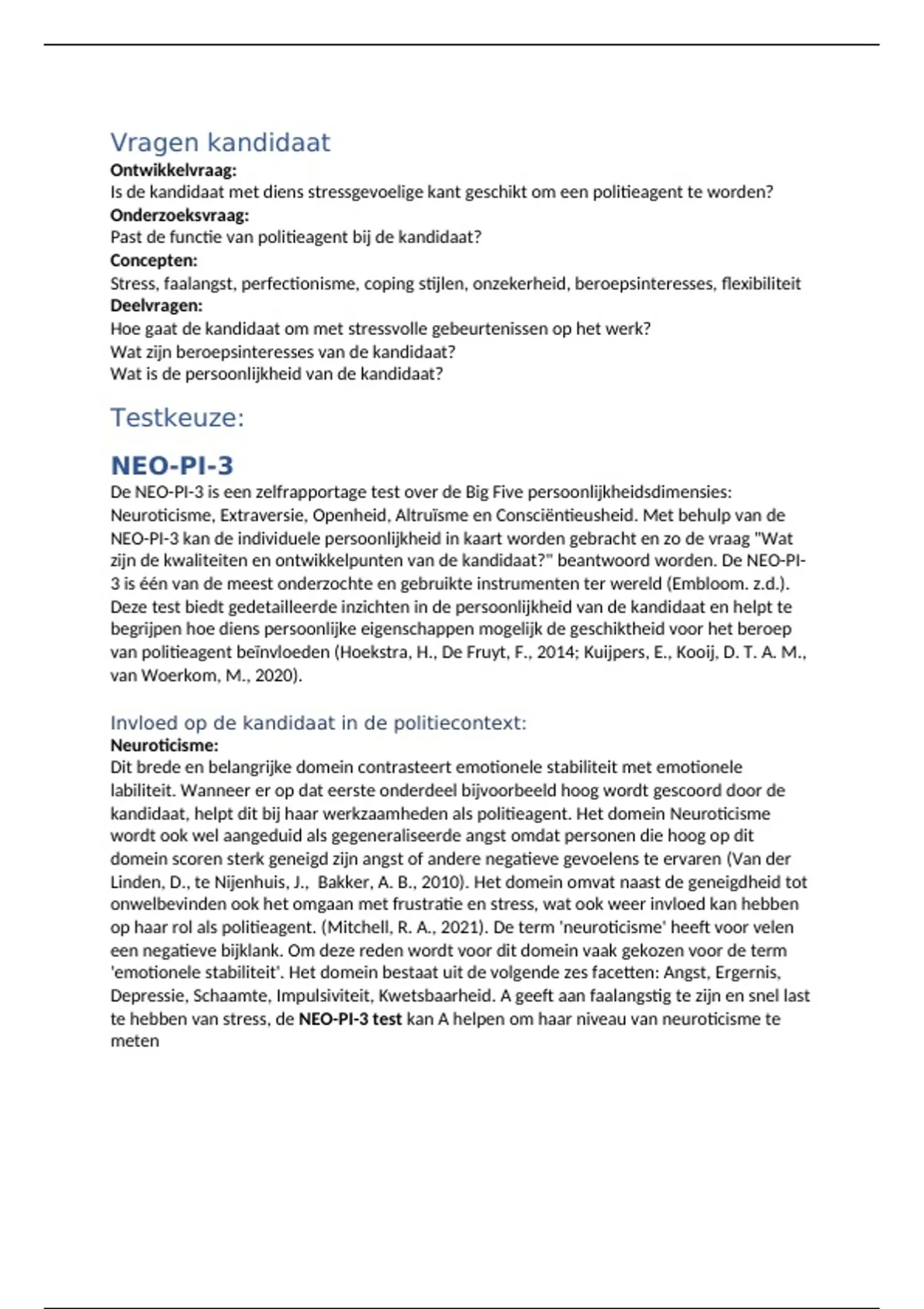 zijn de kwaliteiten en ontwikkelpunten van de kandidaat?" beantwoord worden. De NEO-PI-
