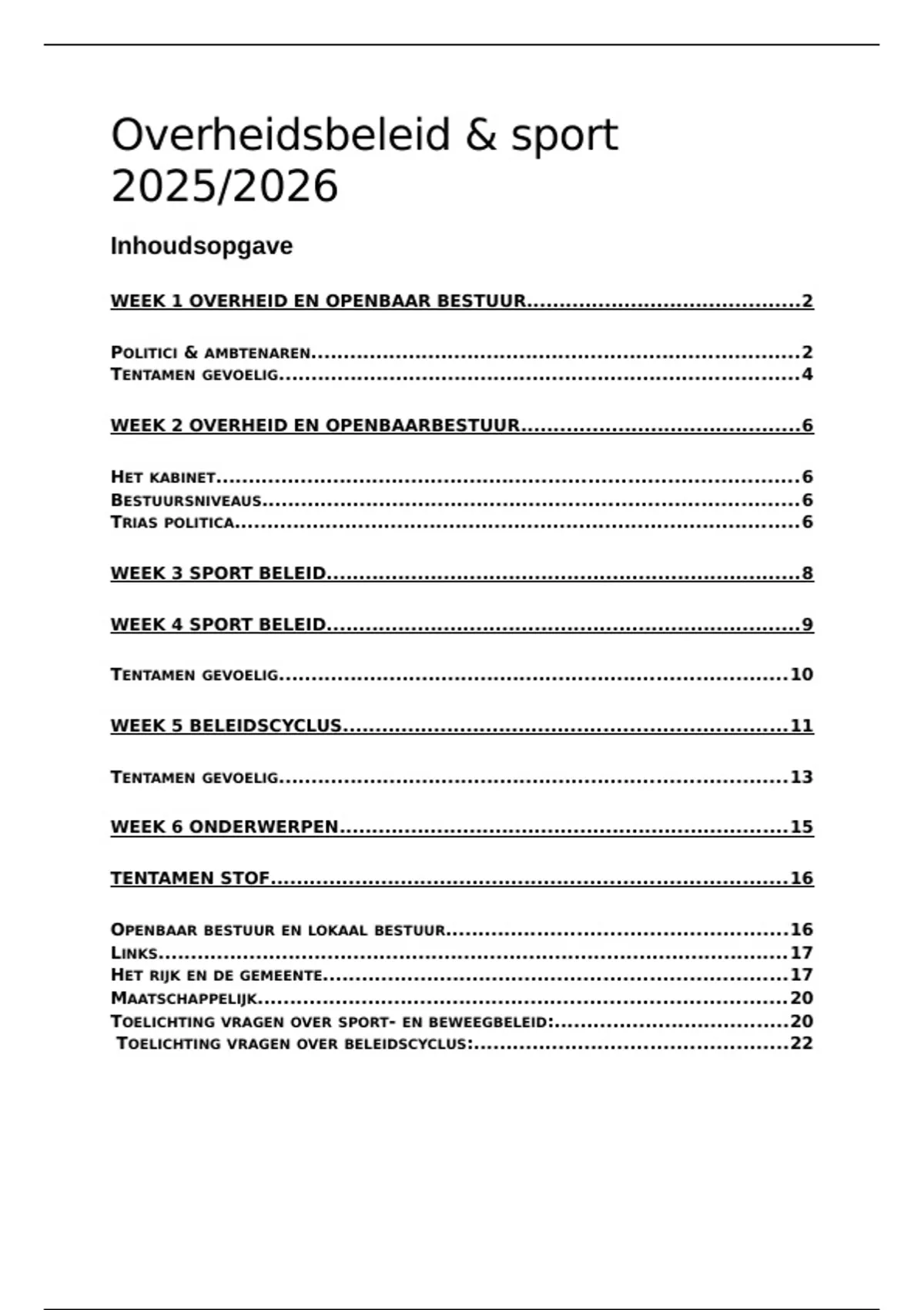In dit document lees je een samenvatting, opgesteld per week, over overheidsbeleid sport. Je leert hoe het openbaar bestuur in elkaar zit, en hoe je bijvoorbeeld vanuit de gemeente naar de tweede kamer kan komen. Ook lees je veel informatie over sportbeleid en het sportakkoord en wie dit regelt. Het laatste onderwerp wat op alles aansluit is de beleidscyclus. Onderaan de samenvatting vindt je tentamenstof van dit jaar (2025/2026) met uitwerking erbij. Vergeet niet de tentamen gevoelige vragen te lezen per week! Succes