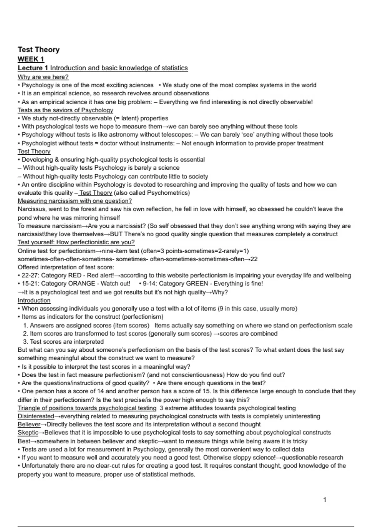 Complete summary of the course Test Theory (500215-B-5), including all lecture slides and personal notes, pictures and graphs. I scored a 10 in the first attempt studying only from this summary.