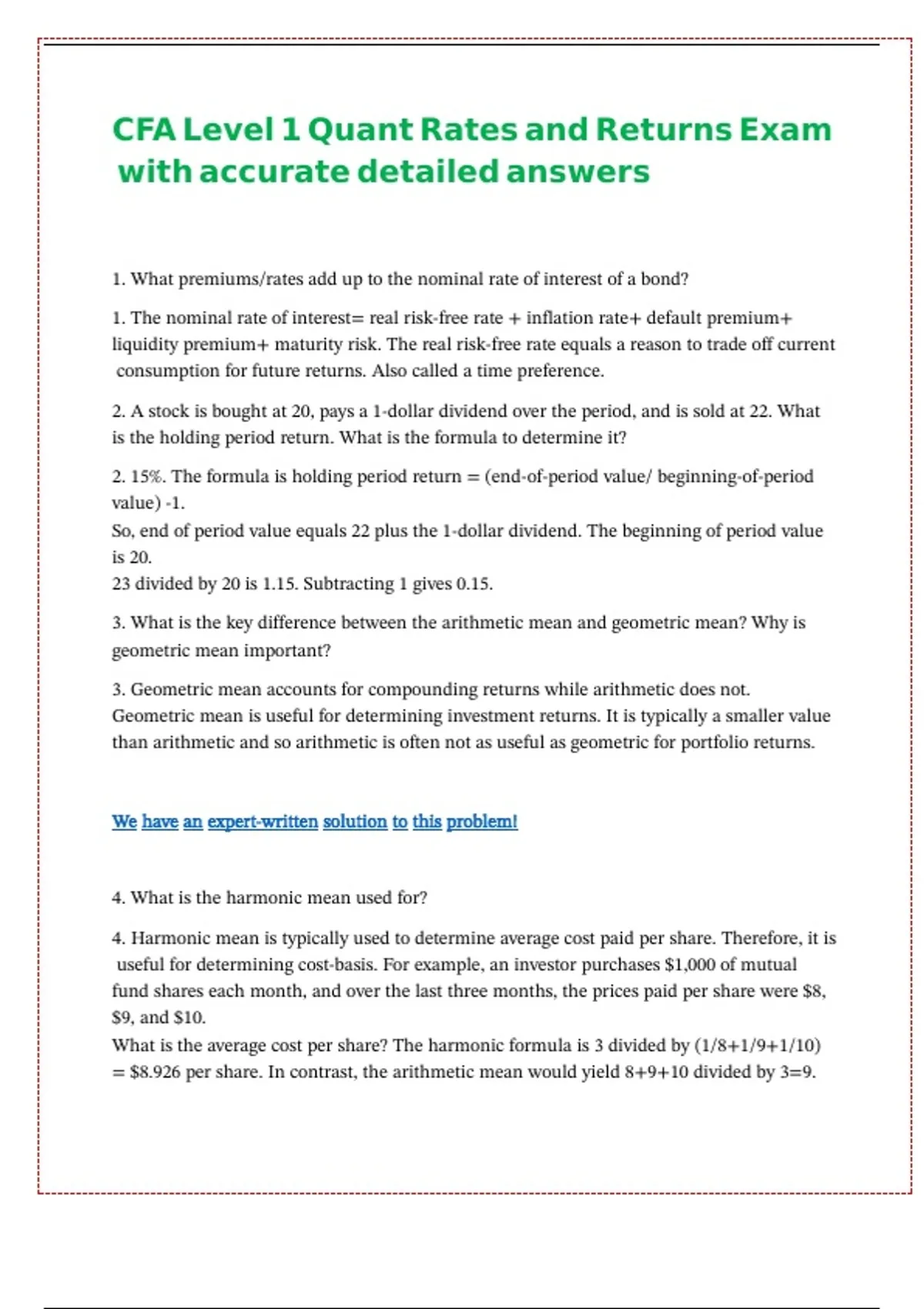 CFA Level 1 Quant Rates and Returns Exam with accurate detailed answers