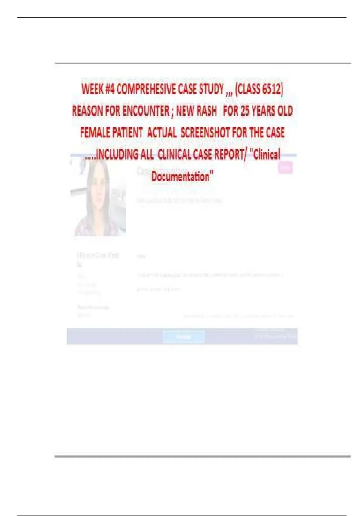 Complete 2025 Week 4 Comprehensive Case Study for Class 6512: 25-year-old female patient presenting with new rash. Includes clinical assessment, diagnosis, and actual case screenshots.