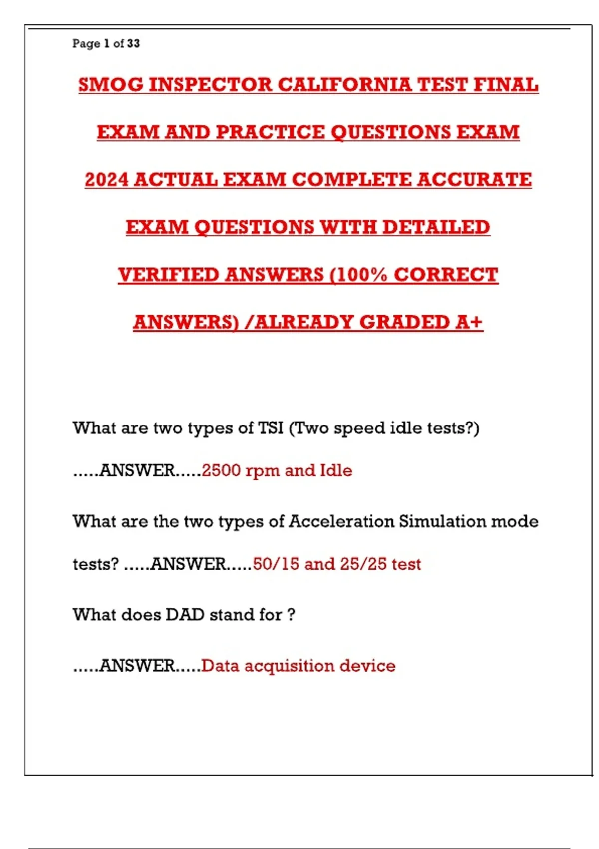 California Smog Inspector Test 2025: Final Exam & Practice Questions with Verified Answers
