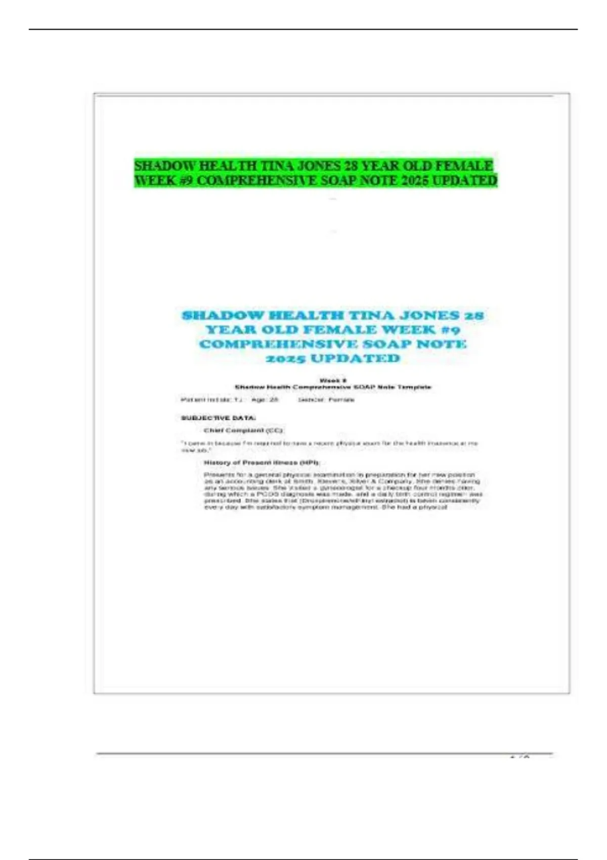 Access the 2025 updated Shadow Health Tina Jones comprehensive SOAP note for a 28-year-old female. Includes Week 9 case study details, assessment, and nursing care plan.