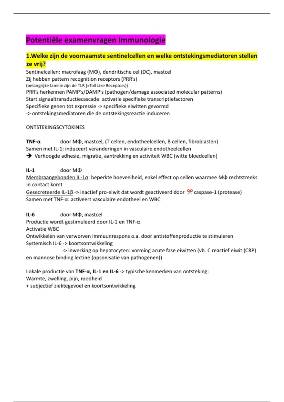 1.Welke zijn de voornaamste sentinelcellen en welke ontstekingsmediatoren stellen