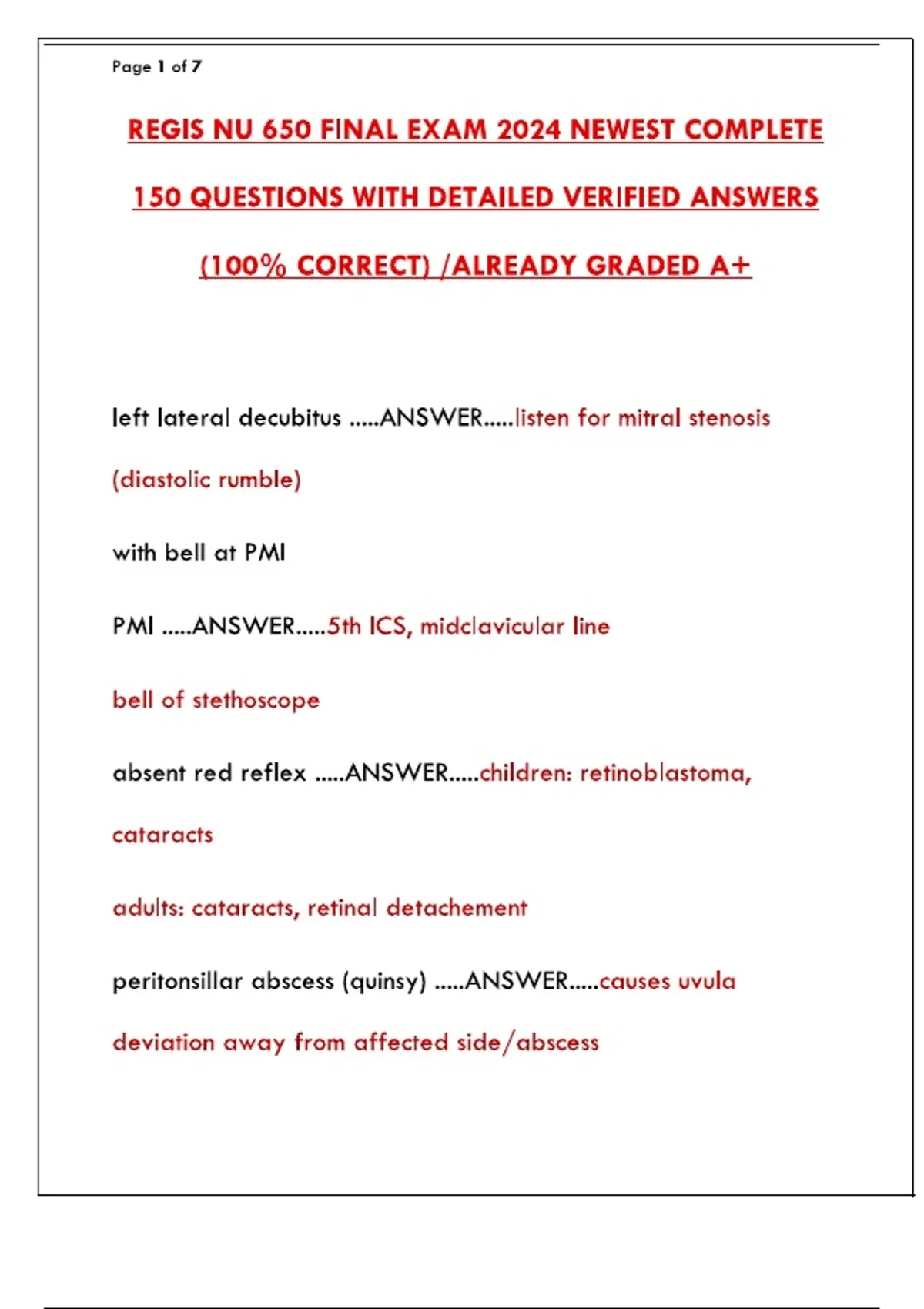 Ace your REGIS NU 650 Final Exam with this complete 2024 study guide. Get access to all 150 latest questions accompanied by detailed, step-by-step answers and rationales to ensure you understand the concepts and are fully prepared for exam day.