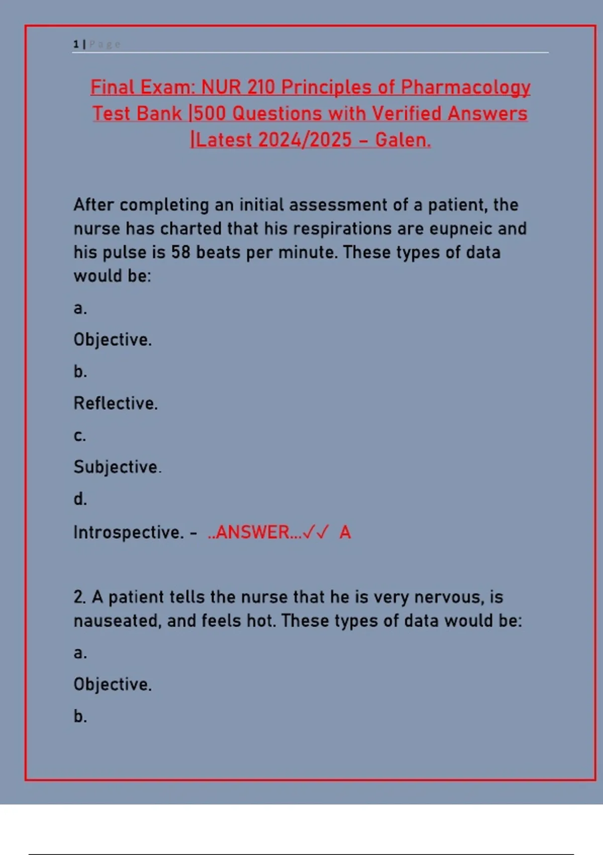 Ace your 2025 NUR 210 Final Exam. Get a comprehensive study guide for nursing principles, fundamentals of care, and clinical skills. Access key concepts, practice questions, and review materials to pass your nursing course with confidence.