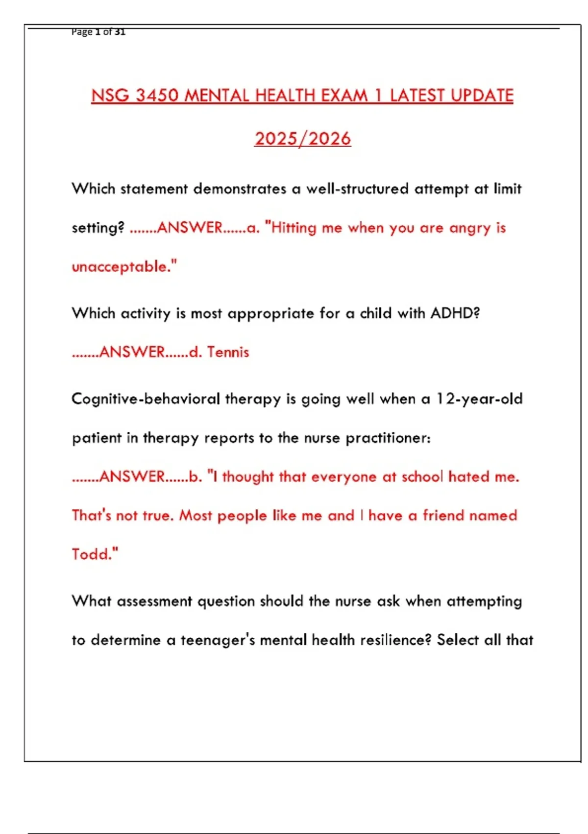 Ace your NSG 3450 Mental Health Exam 1 with this latest 2025/2026 updated guide. Covers essential theories, psychopharmacology, therapeutic communication, and nursing interventions for mental health disorders. Get the key concepts and study materials you need to succeed.