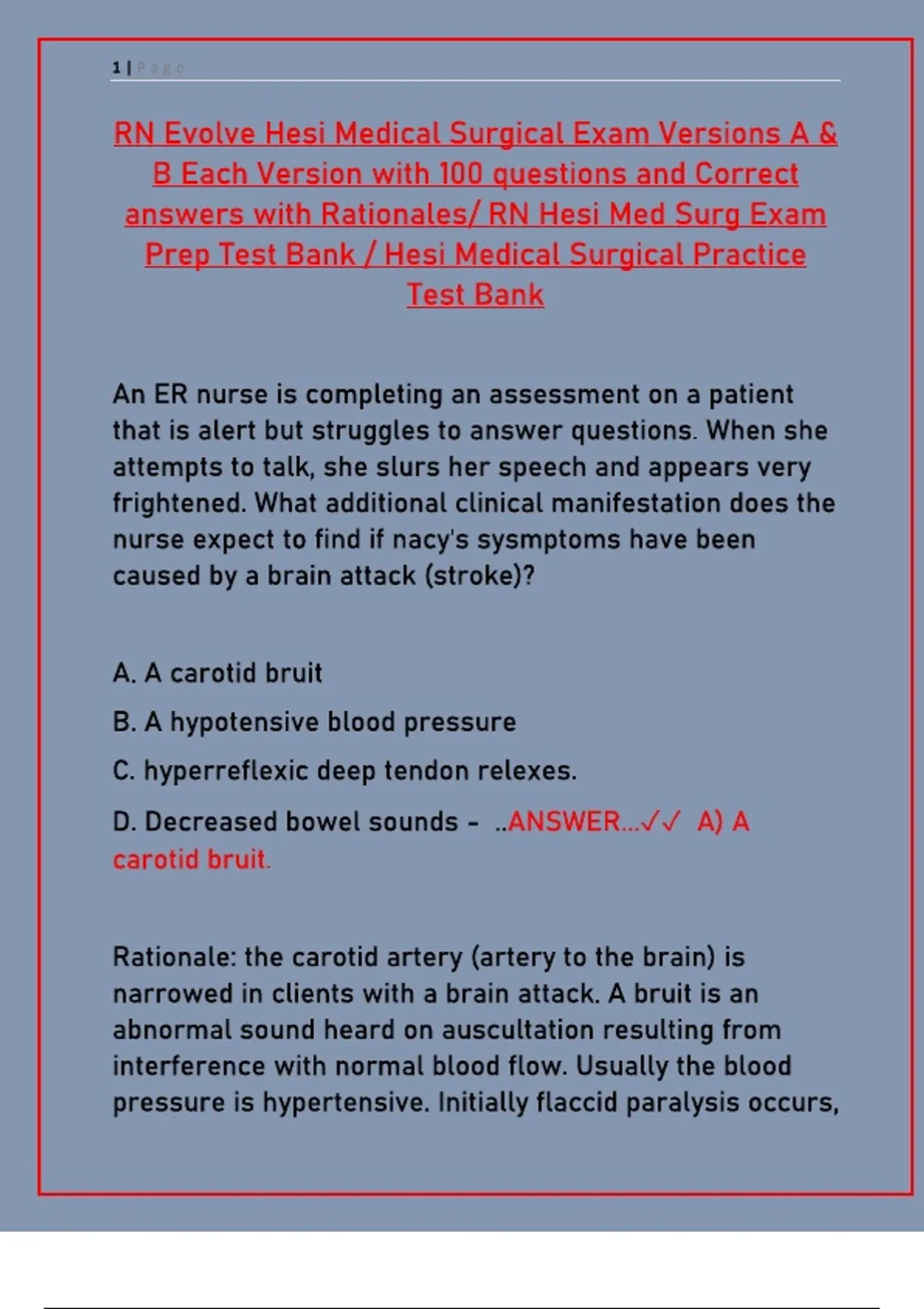 A comprehensive guide to the RN Evolve HESI Medical Surgical Exam (Version A). Includes key topics, practice questions, rationales for answers, and test-taking strategies to help nursing students achieve a high score.