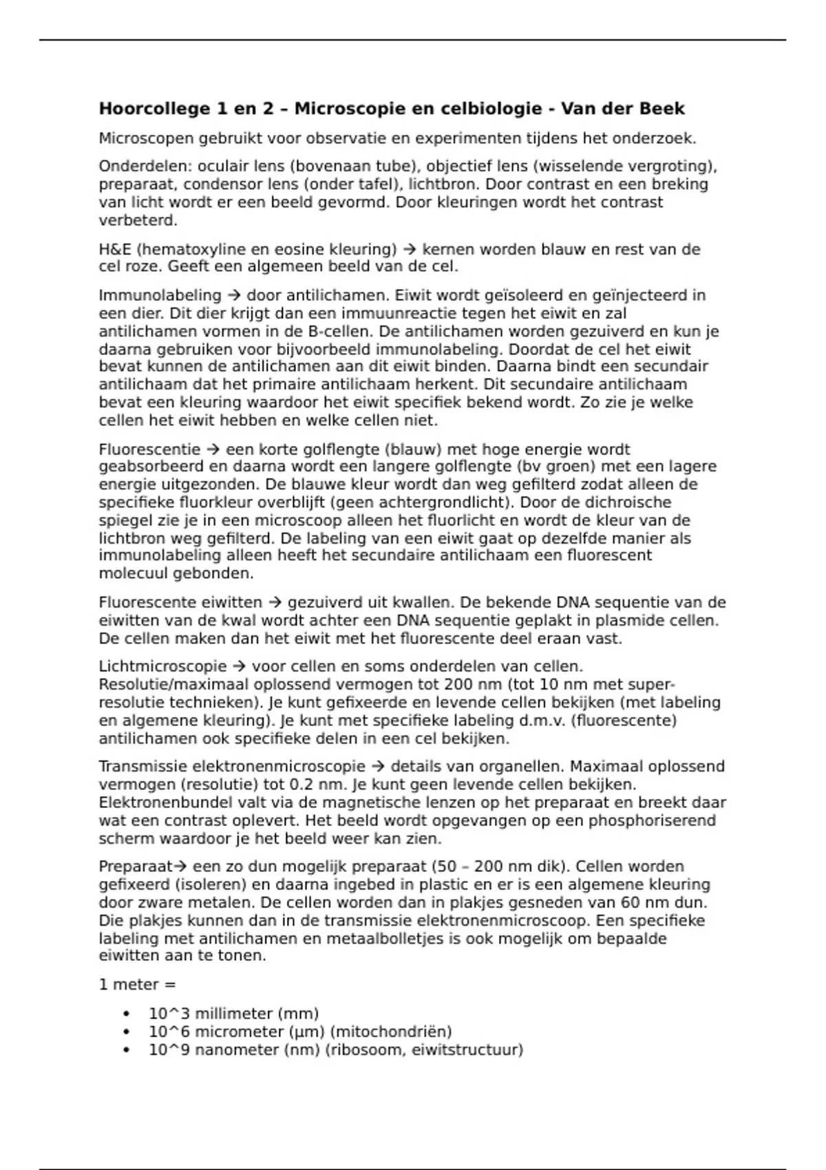 Hoorcollege 1 en 2 – Microscopie en celbiologie - Van der Beek