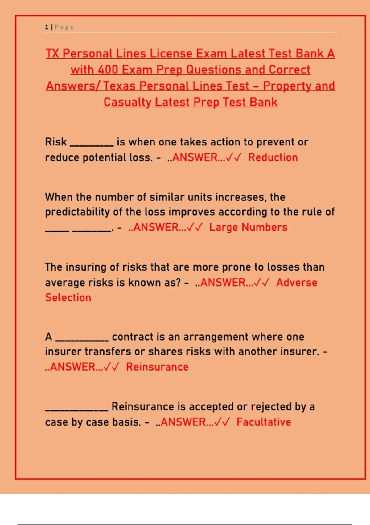 Get ready for your Personal Lines License exam with our latest test bank. Features 400 practice questions with verified correct answers for the most effective exam preparation.