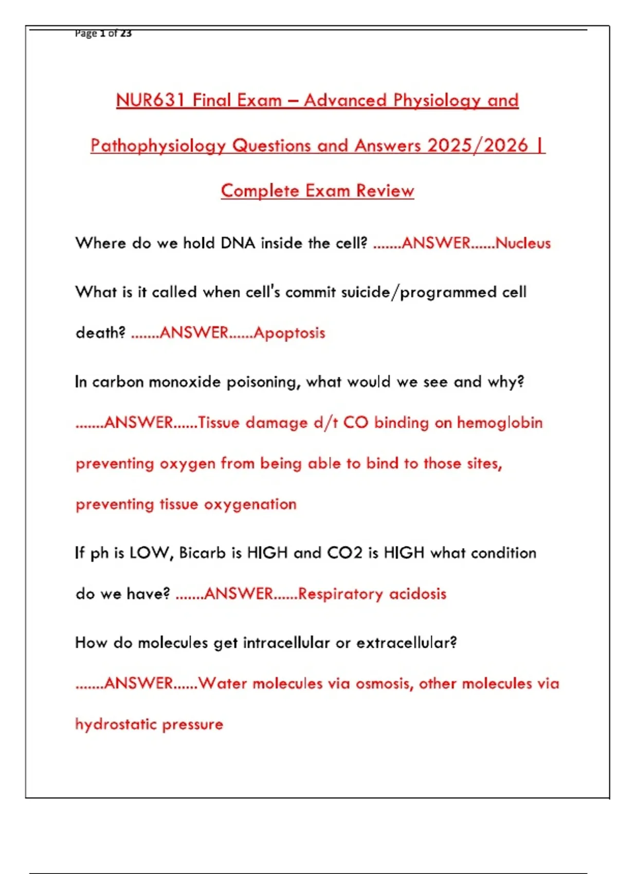 Prepare for your NUR631 Final Exam with this comprehensive guide. Covers advanced pathophysiology concepts, pharmacotherapeutic interventions, and clinical decision-making for complex patient conditions. Includes key topics, potential exam questions, and study resources to help you master the material and succeed in your advanced nursing practice course.