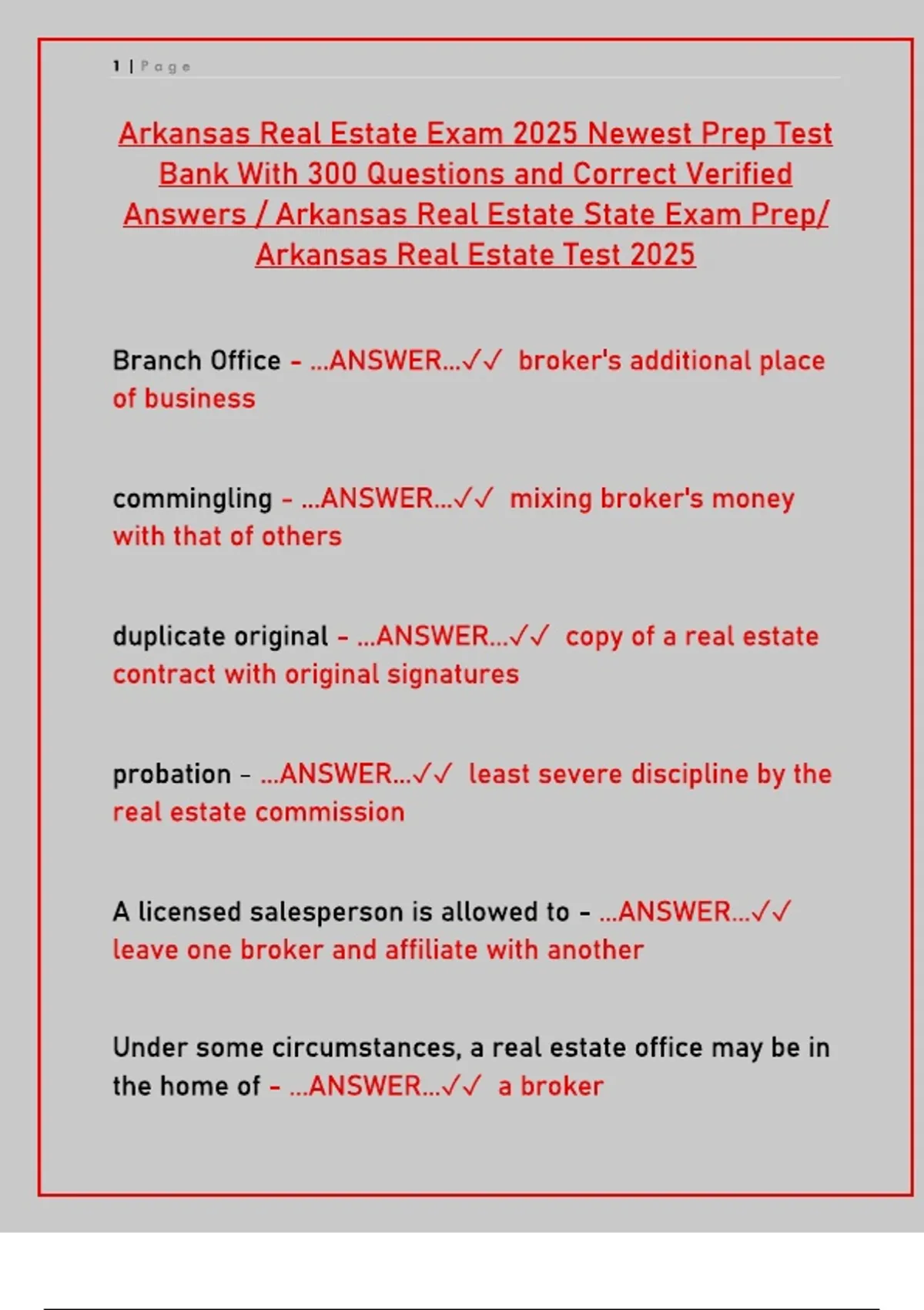 Prepare for the 2025 Arkansas Real Estate Exam with our newest test bank. Features 300 practice questions with correct verified answers for salesperson and broker licensing.