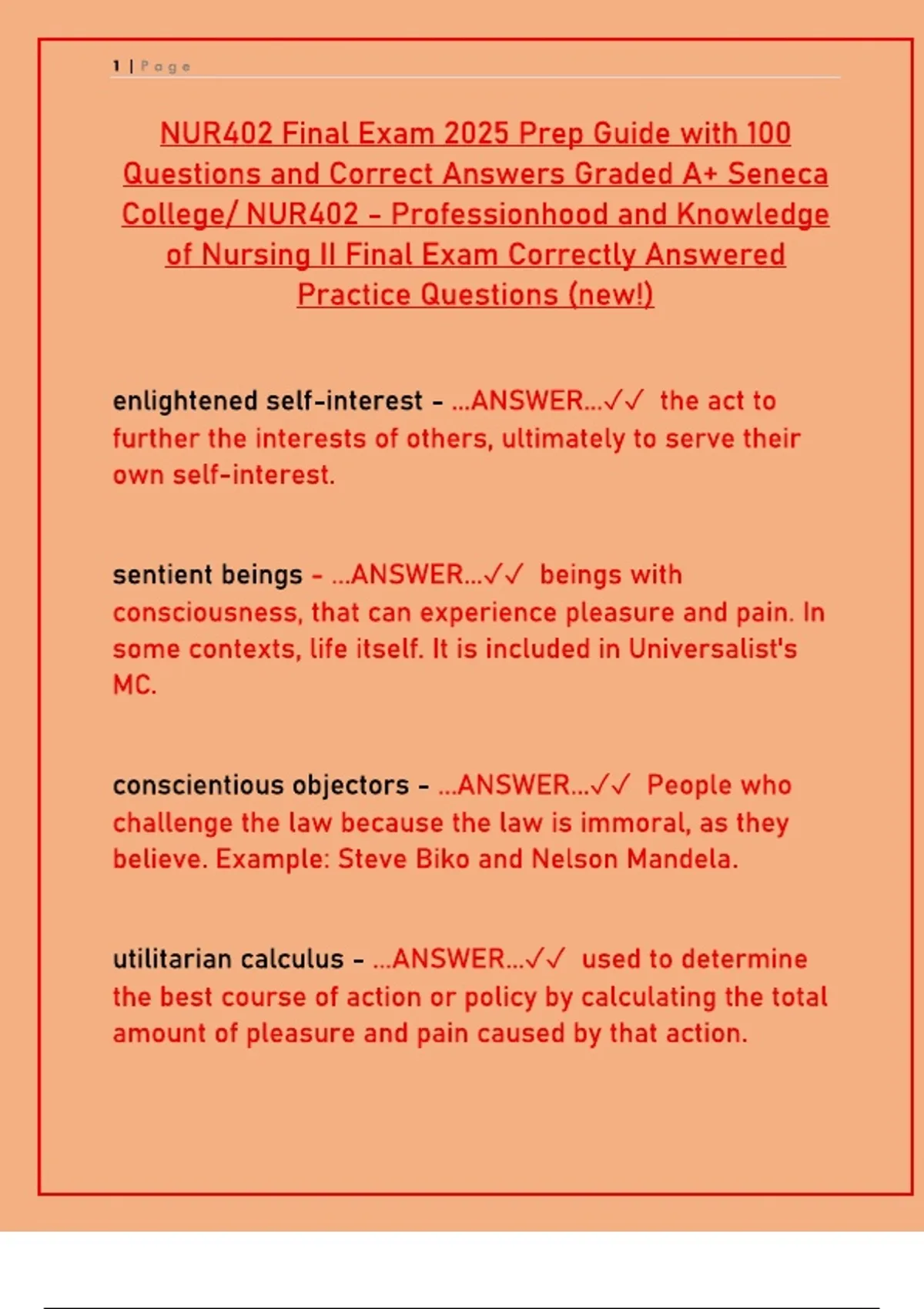 Ace your NUR402 Final Exam at Seneca College in 2025. This prep guide features 100 practice questions and verified answers on nursing ethics, philosophy, moral theories, and professional conduct.